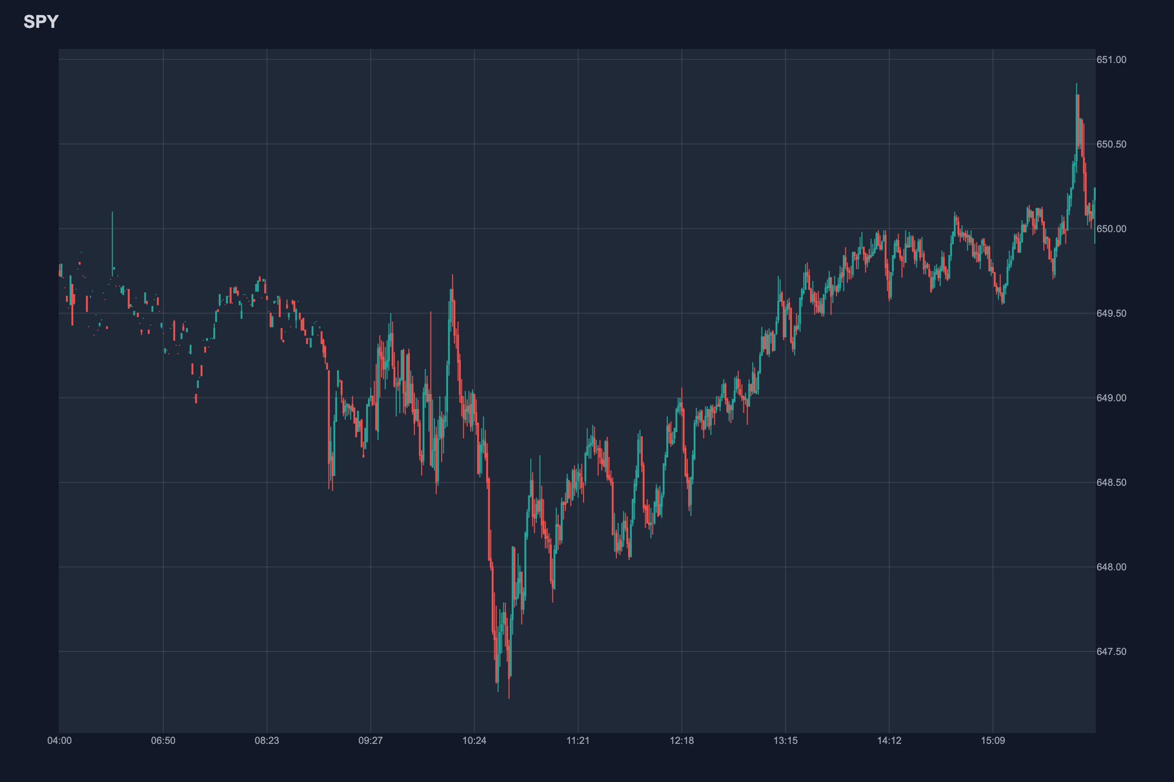SPY shows upward momentum in premarket, closing at 653.81, just below resistance at 653.86. The chart indicates a bullish bias with recent bounces from supports, positioned above the pivot at 650.54.