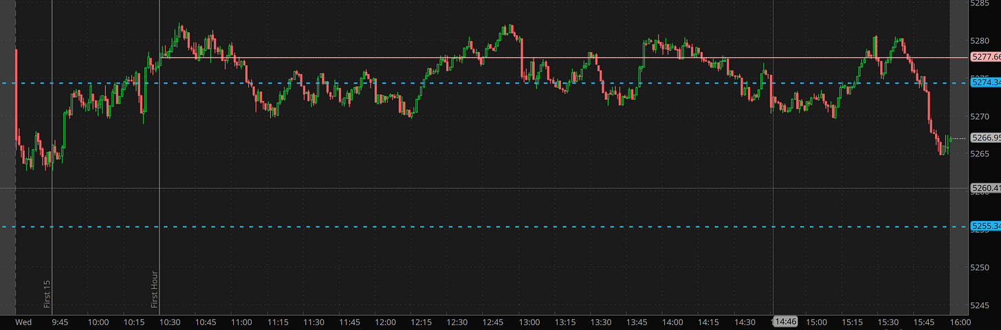 I’m show SPX so you can see how using the levels is easy to plan. All day you can see how 5280 is rejected and 5270 was bought. The problem is the the premium in the contracts and the gap down. In theory we want to long for gap fill, but if after the first 2 hours we aren’t trending and filling the gap, that is normally a bearish indication.