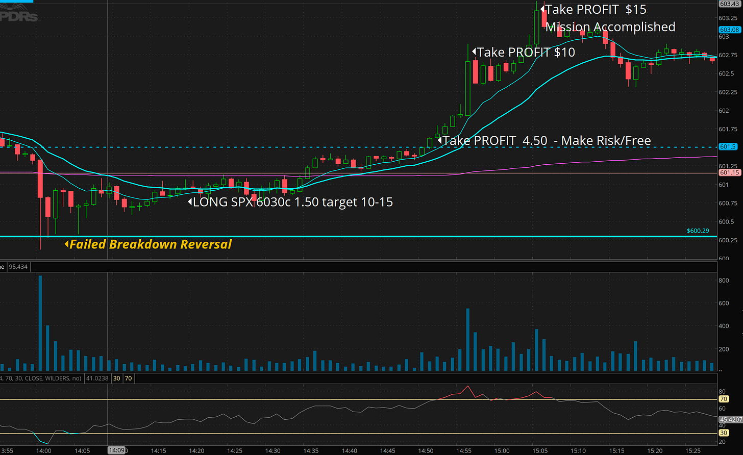 This was masterful imho. I alerted I wanted 6030c for 0.50 to 1.50 for a squeeze. if you count 2 levels up that is 603.50 on SPY and 6045 on SPX. That means SPX 6030 will hit $15 if I’m write. It hit $16.60!!! Time in Trade: 40 minutes for 1000% !