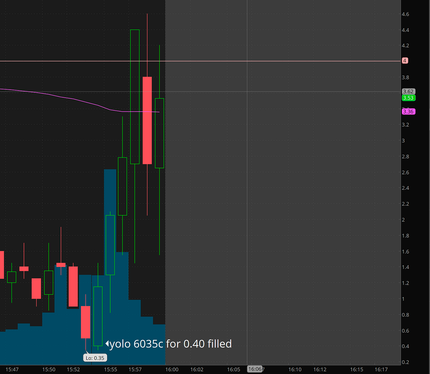 Give the chop and wild moves at the close I plan puts but I unfortunately did not alert the long side that I took. things moved so fast it was hard to. I placed orders for SPX 6035c for 0.40 and 6030c for 0.40.
