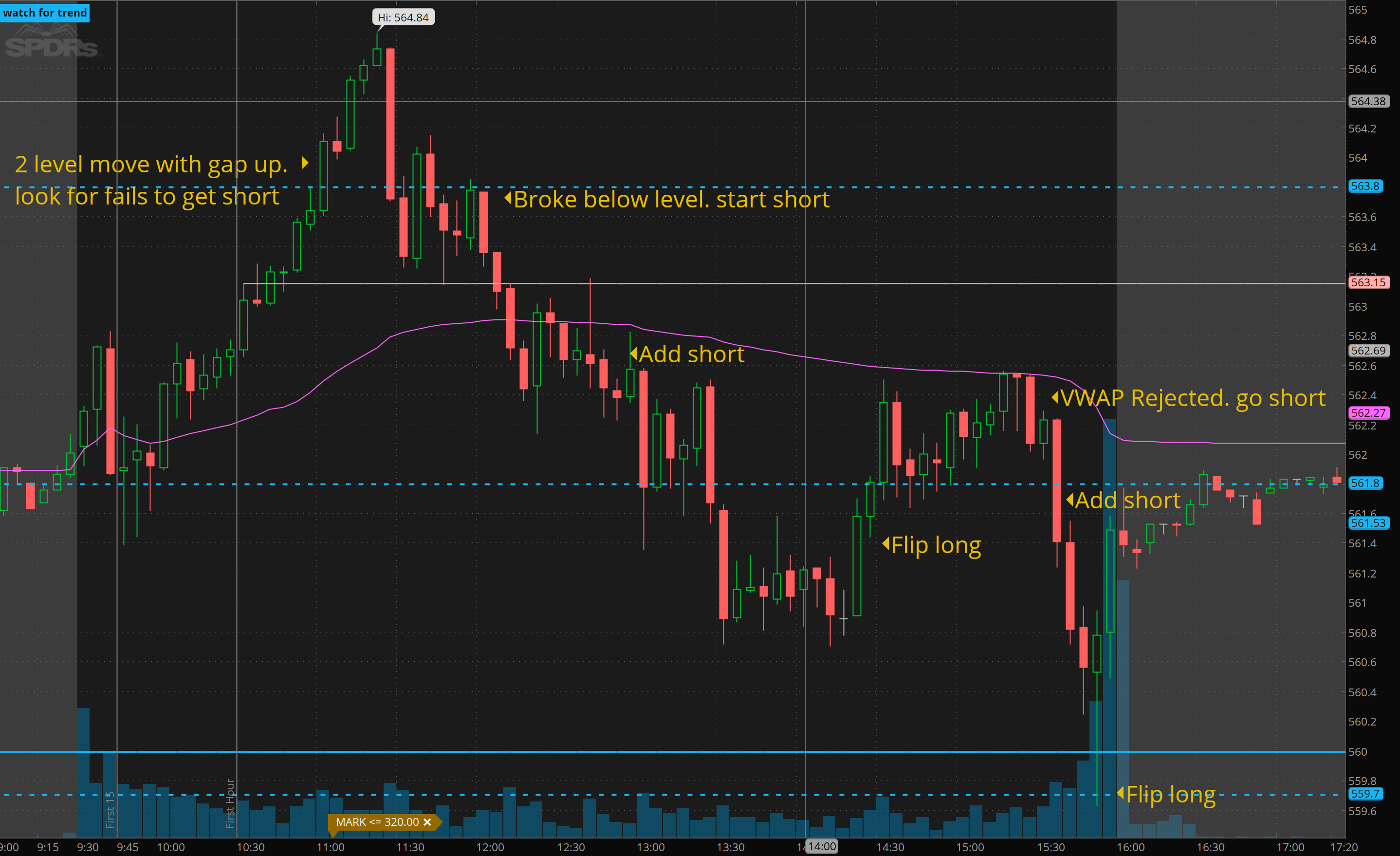 After lunch 561.80 support failed and I started looking for 561.50 to be reclaimed to get long thinking we close over vwap.