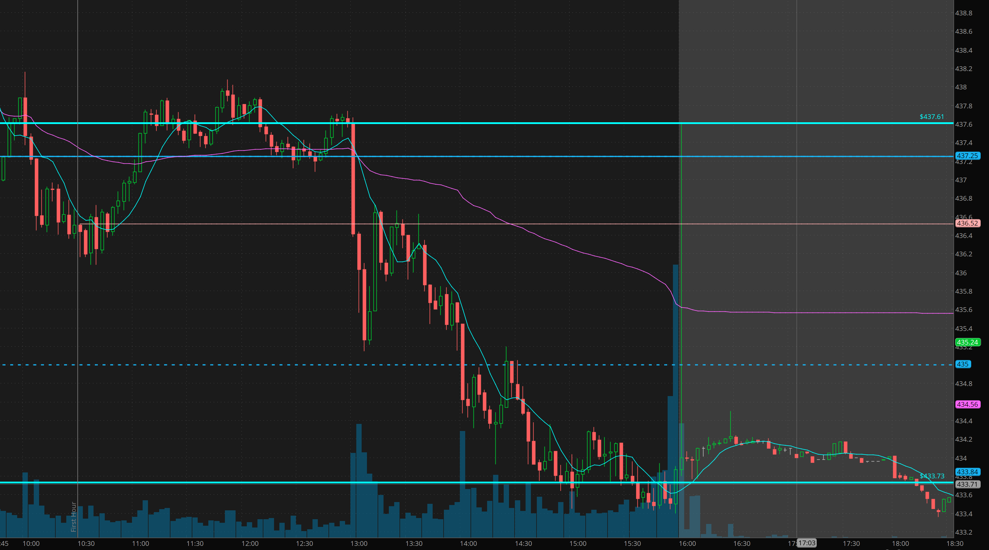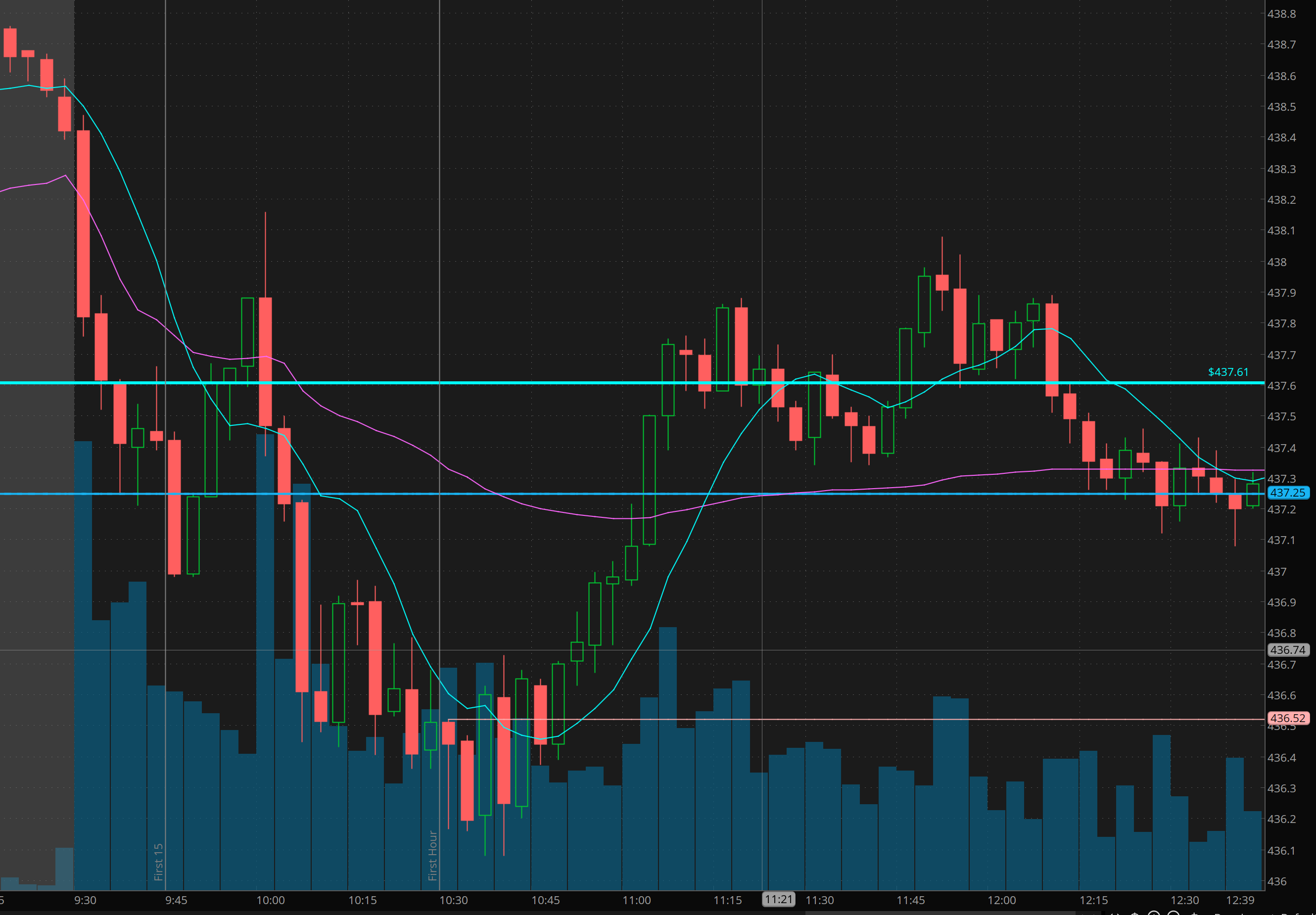 The morning action was clean and we got long after the test of the 436 area, planning for a breakout out over 438 to continue to 440. I made this trade plan and both T1 and T2 were met.