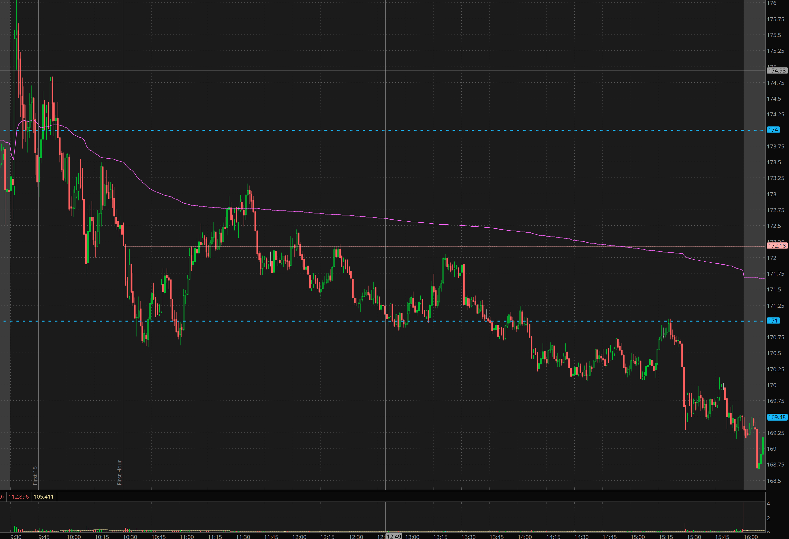 So yesterday I wrote, if 172.50 breaks , I want 167.50p. So it broke, now where do I want to get in? Ideally on a back test of 172.50. In our case that was a failed push into 173 and break back under vwap.