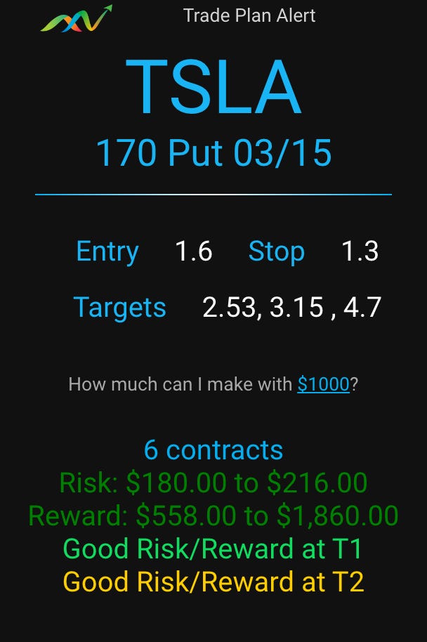 if using Edge, type /plan b TSLA 170p 1.60 s 1.30 and it will generate sell targets for you. Below is the generated plan using 1k in capital. Both T1 and T2 were hit by the close. and we may get T3 this morning.