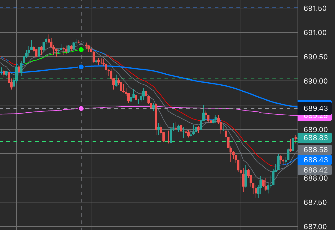 Premarket at 688.50 eyes pivot test—failed breakdown setups prime for reversal gains