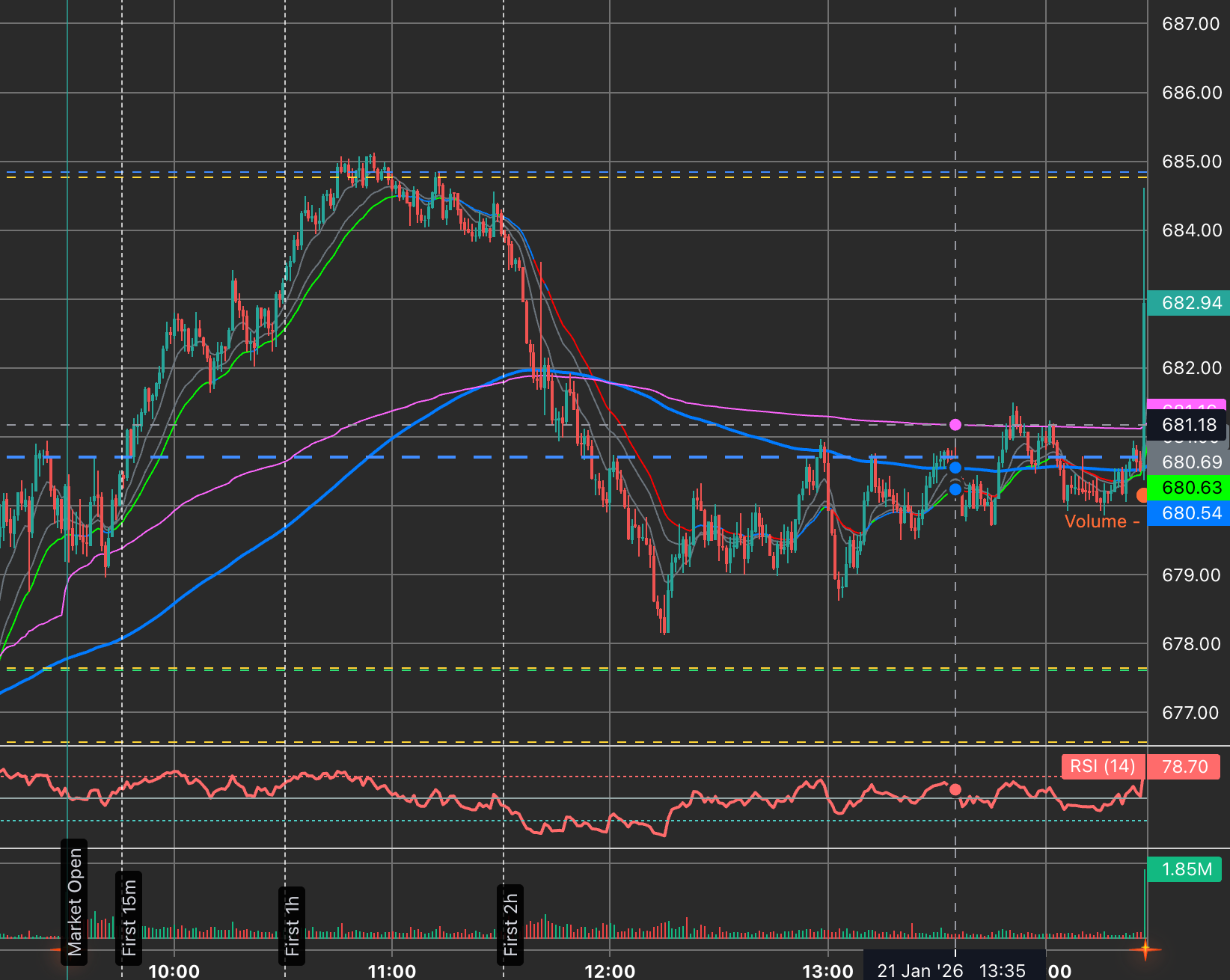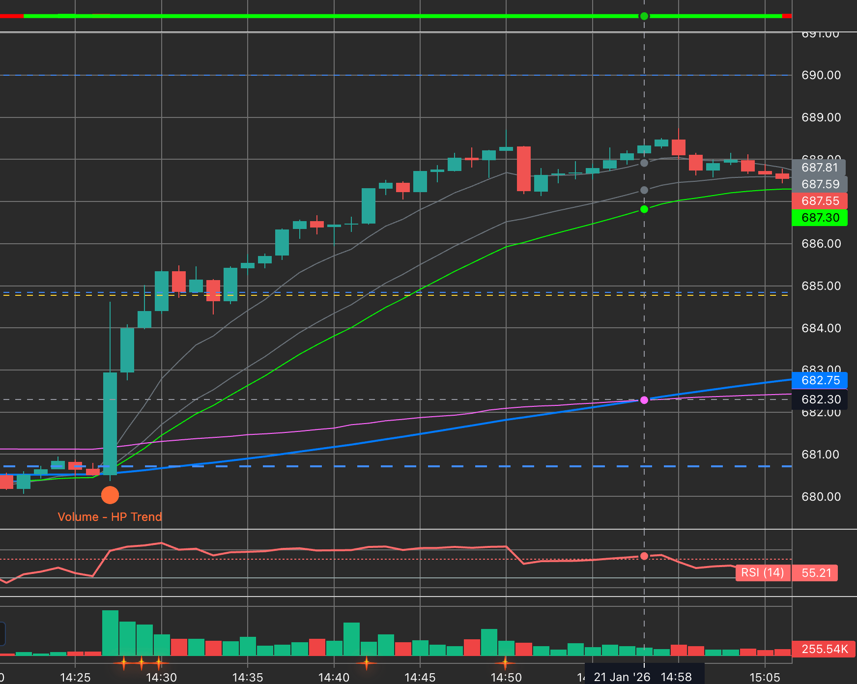 Premarket at 689.73 holds pivot—watch failed drops to 683.7 for quick wins