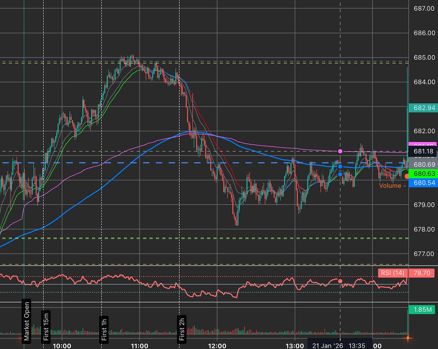 We didn’t the the primary idea dip on 676 for a long, but based on price action I took 2 sets of bull puts early assuming a bounce one come. 1 right at open and the other after seeing vwap hold and cross hod using AlphaOS. made it easy. both went to 0 by end of day and 0.20 or less by 11am!