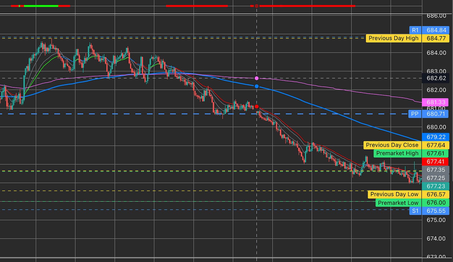 Once the blue line and vwap were broke after 12pm, it was non stop selling. The tick to join was easy. basically any pop to the red line allowed for an entry. We almost got to the 676 level I shared yesterday