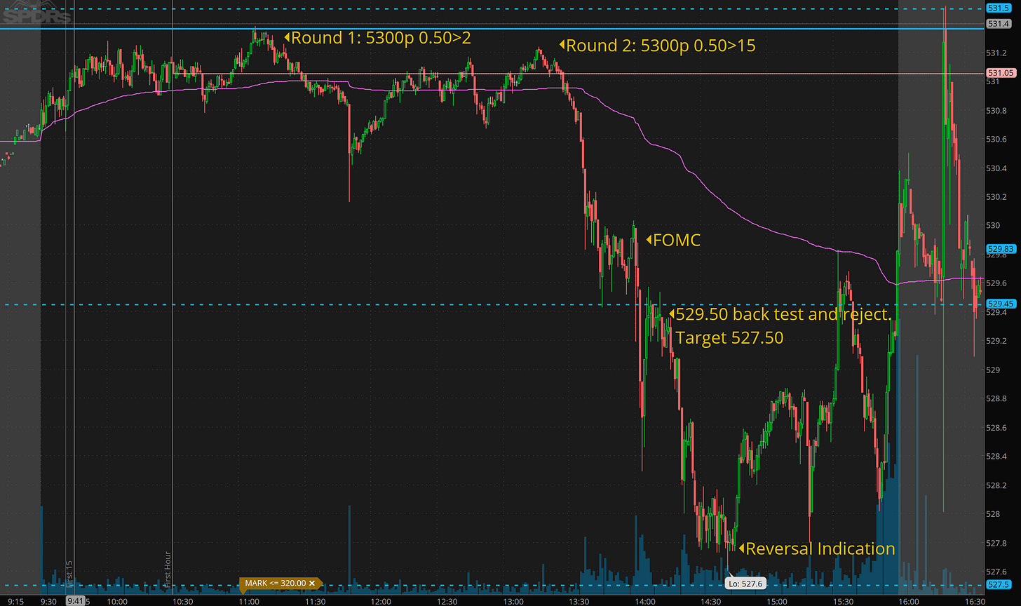 We got just that. The selling started in earnest after lunch and FOMC was the trigger that broke the 3 day support at 529.50. We then got the trap of shorts as we dumped into 527.60. This is what market makers do. They create liquidity. They run stops so they can position for the next leg. Our job as traders is to plan for that and to recognize when this has occurred.