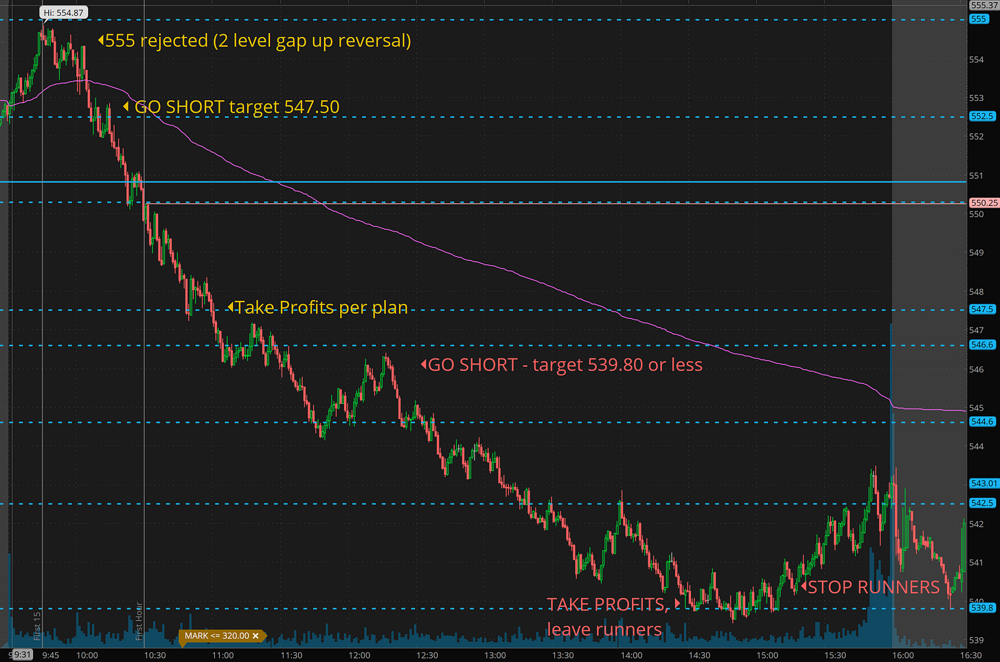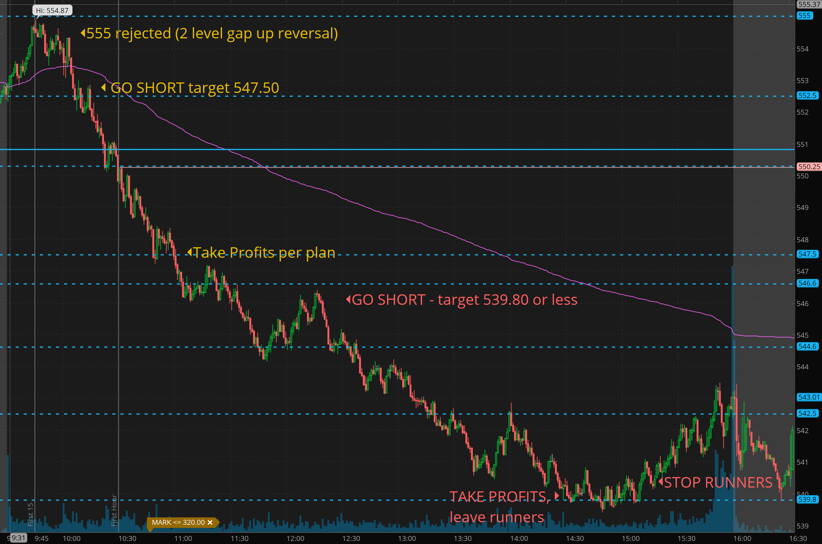 The key point is, I planned and traded my plan and got paid. I didn’t expect the break, but once 550.50 started to break, I told members that if 547.50 broke, we could completely reverse gains from thursday, and I expect 538 will come. In premarket today we are at 536.