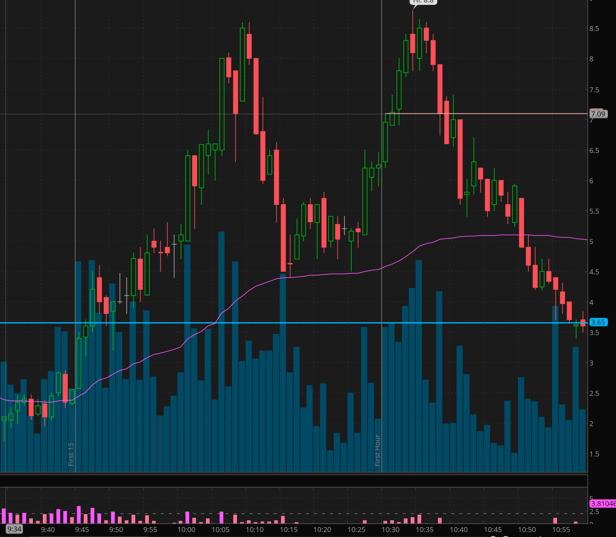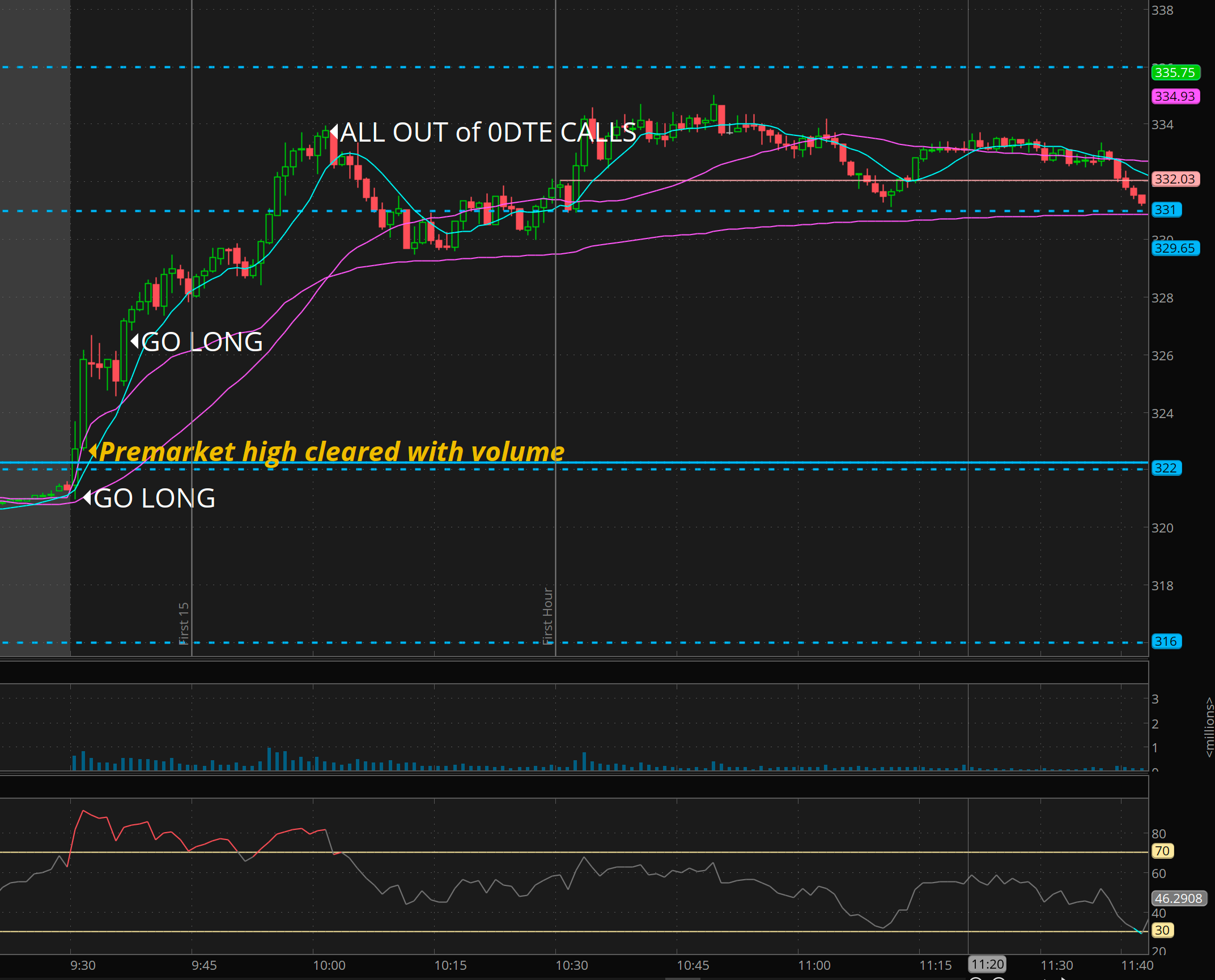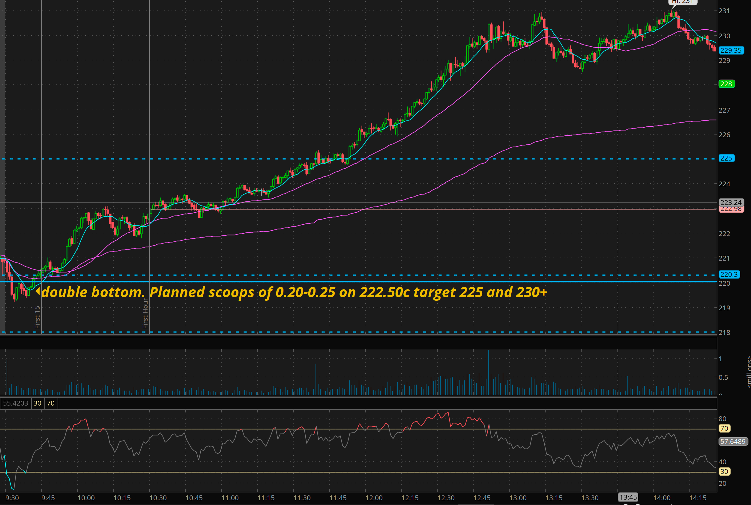 The setup on this was conviction that 225+ could come. Notice how SPY held about the 34ma on 1min. (its a great moving average to keep you in the trade! until price breaks it. I like to use 20ma for entries to join trend.