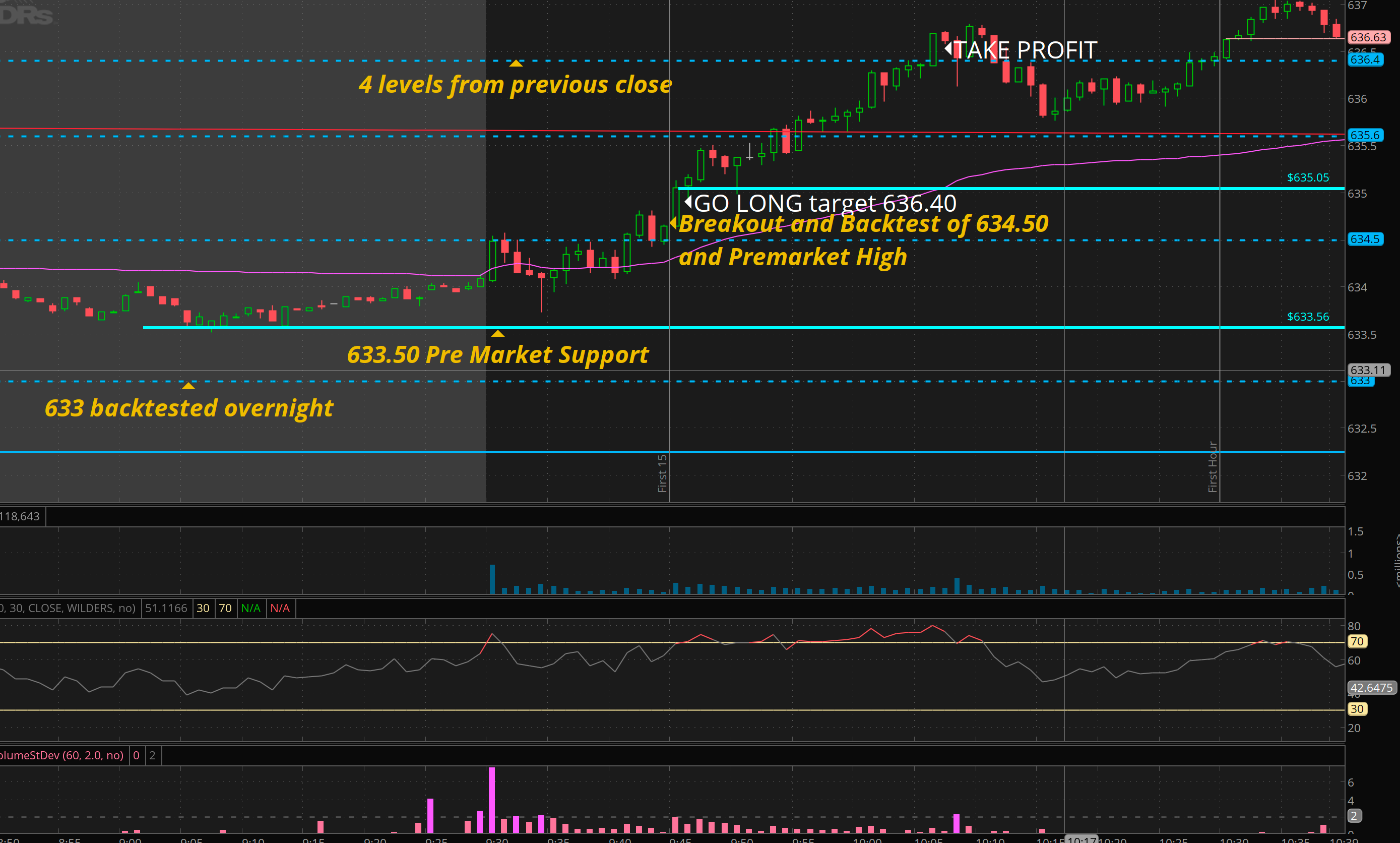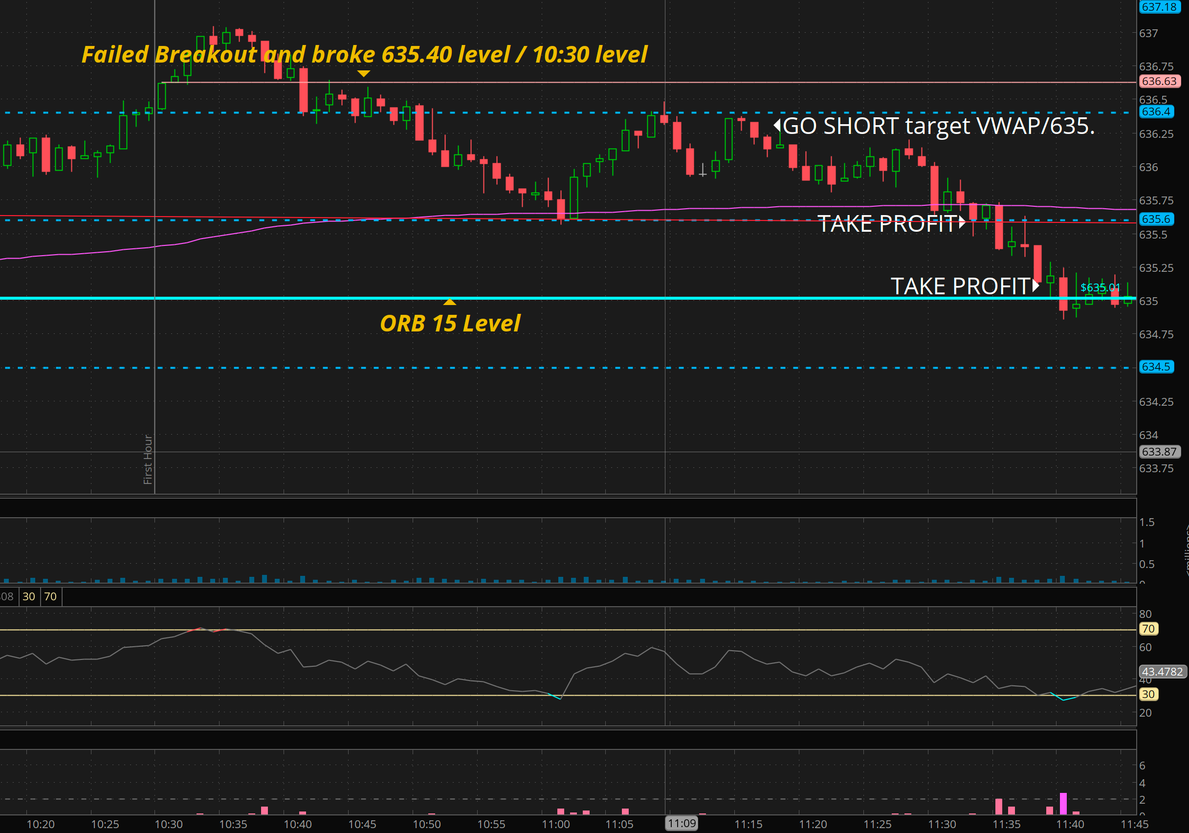 So I told THT PRO members I was expecting 635 to come — how did I determine that? it was the ORB 15 level. Many times on strong names a retrace to that level will come. It’s a fantastic risk/reward long spot! Usually that dip will come after 11:30 or after 1:30. and then a rally/bounce after.