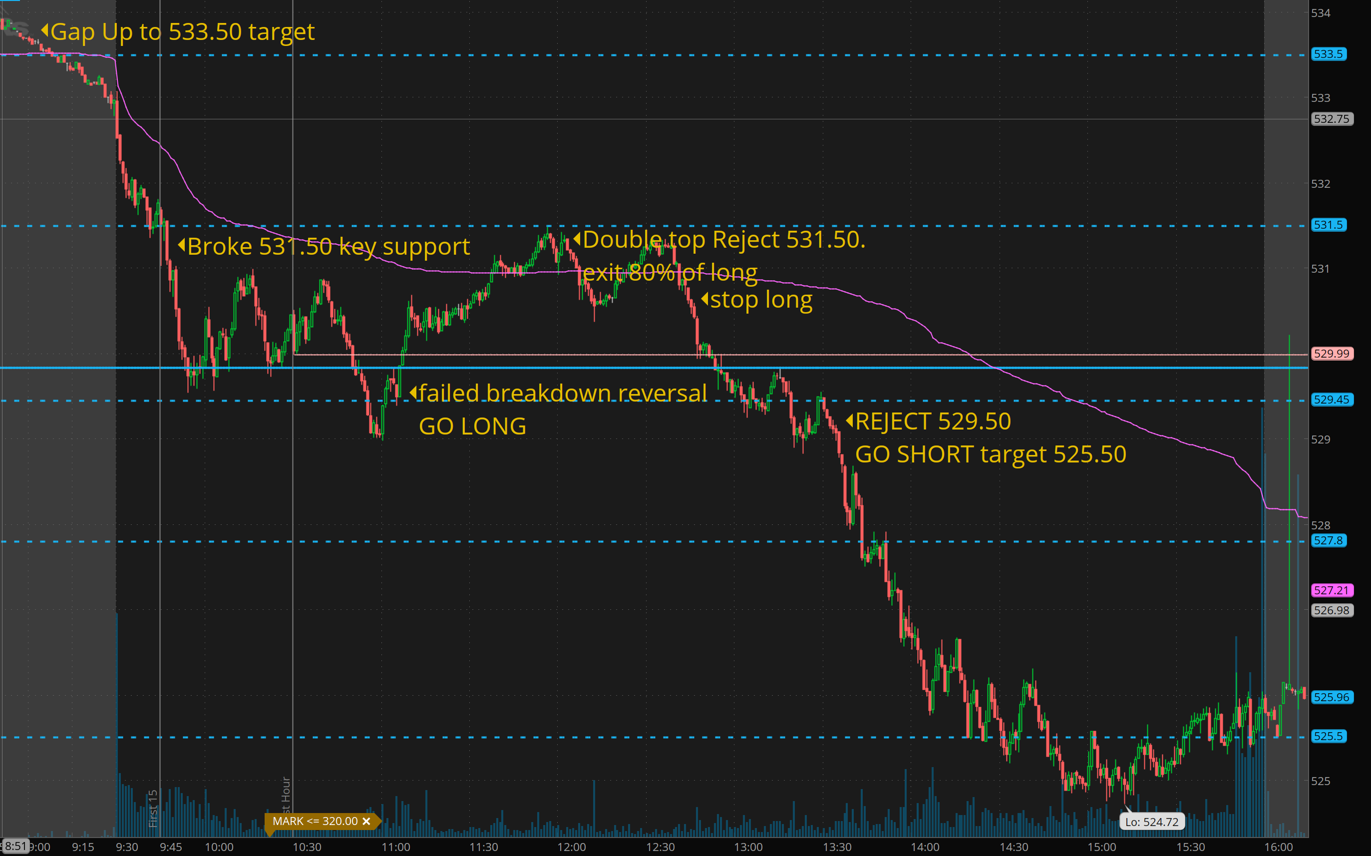 For strong upside move 531.50 should not have broke, but once it was rejected again at lunch then the 529.50 dip buyers were put on watch.