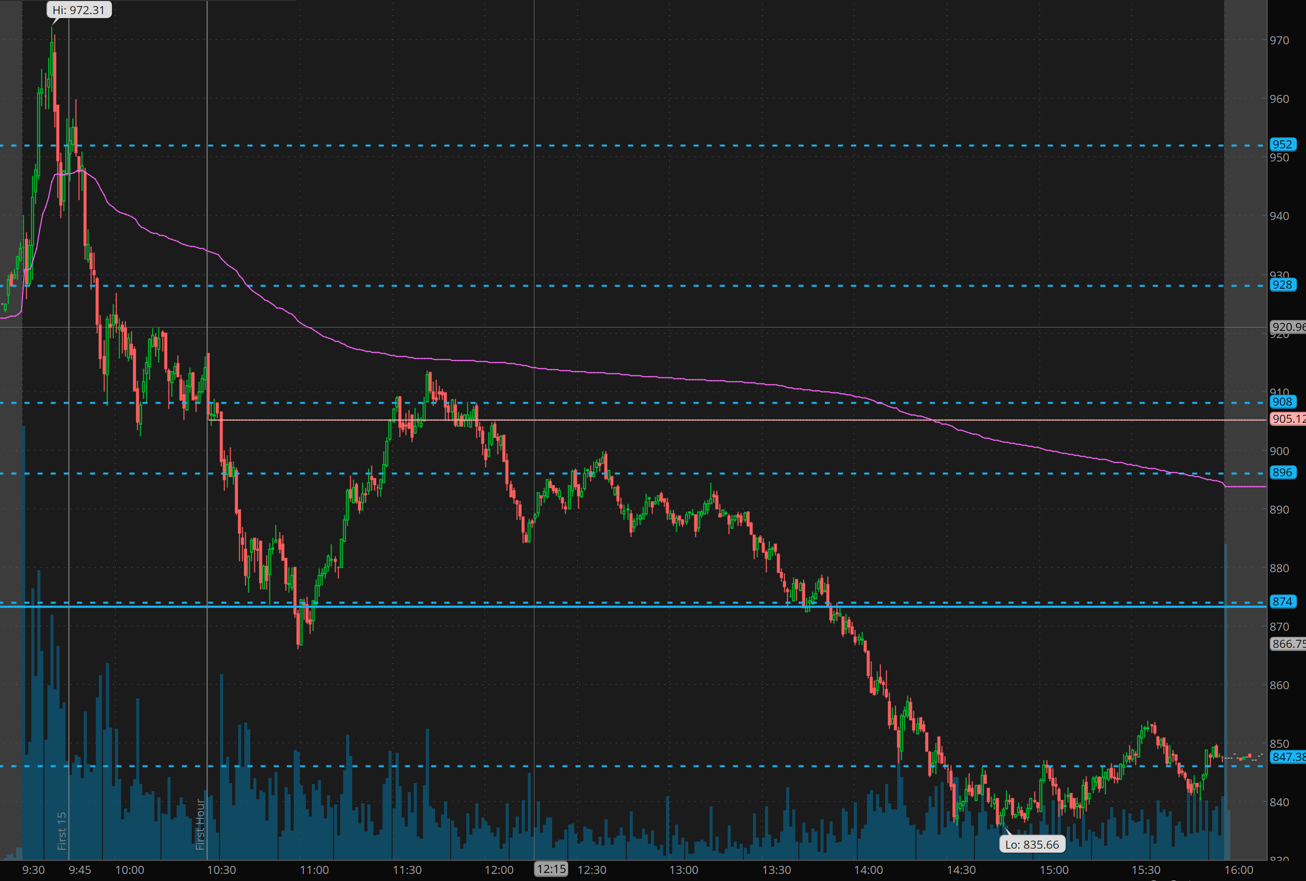 This time there isn’t another news catalyst, so we got short and took 870p and 820p once 928 was rejected. Trend was established and we even got a vwap retest for a reload.