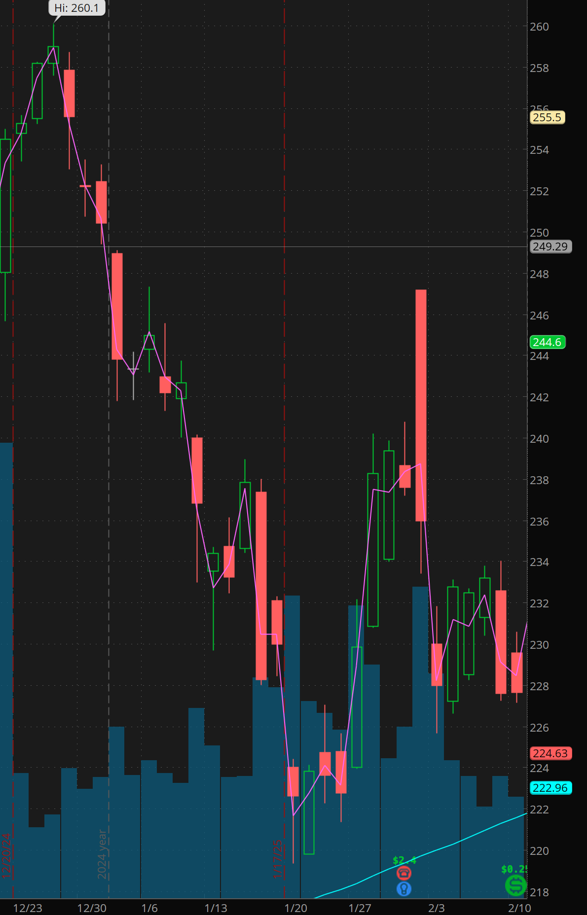 Monday morningI looked at the 235c options chart. with an 80-90% probability of $3-5 payout and seeing that we were around 0.70c at the close on Friday. I said, if I can scoop anywhere under $0.50 I like it. From past experience, I have had great results when I scoop for 0.30-0.50. So I alerted members my intention to scoop at 0.35. (I was happy to buy anywhere under 0.50). If my thesis was right a payout was coming.