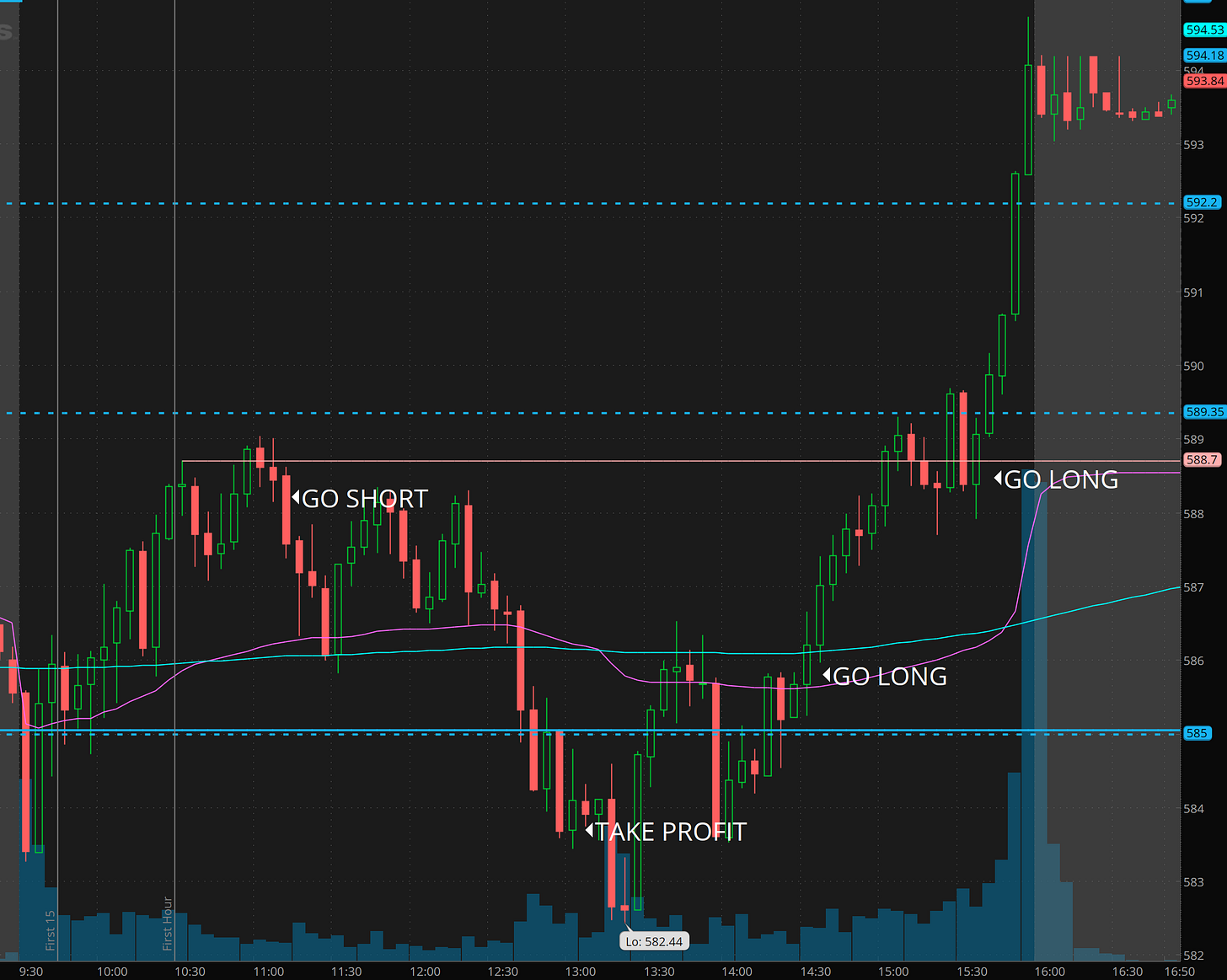 Predicted the dip price to scoop SPX 5920c however since brok back under 585, I cancelled the order. I then got long paying 4x more on 586 cross.