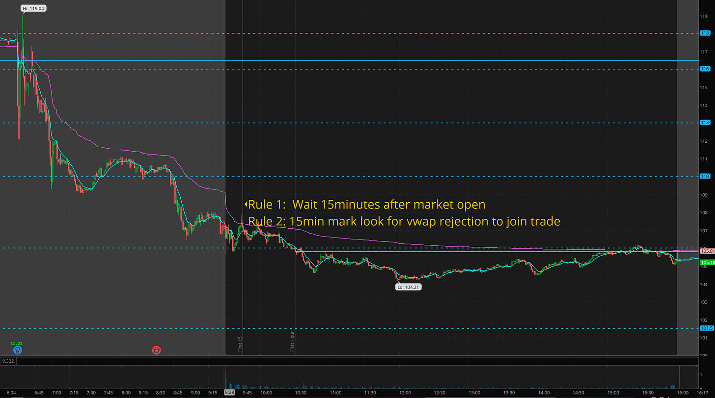 Check out the huge gap down on DIS after e/r. At first I wanted a pop to 110 to get short, but the premarket action showed weakness, and then at the 15min mark there was a strong rejection of vwap. so we plan the short. I was already anticipating the rejection, and my plan for 101.50 or less target meant an entry under 0.50 would be good.
