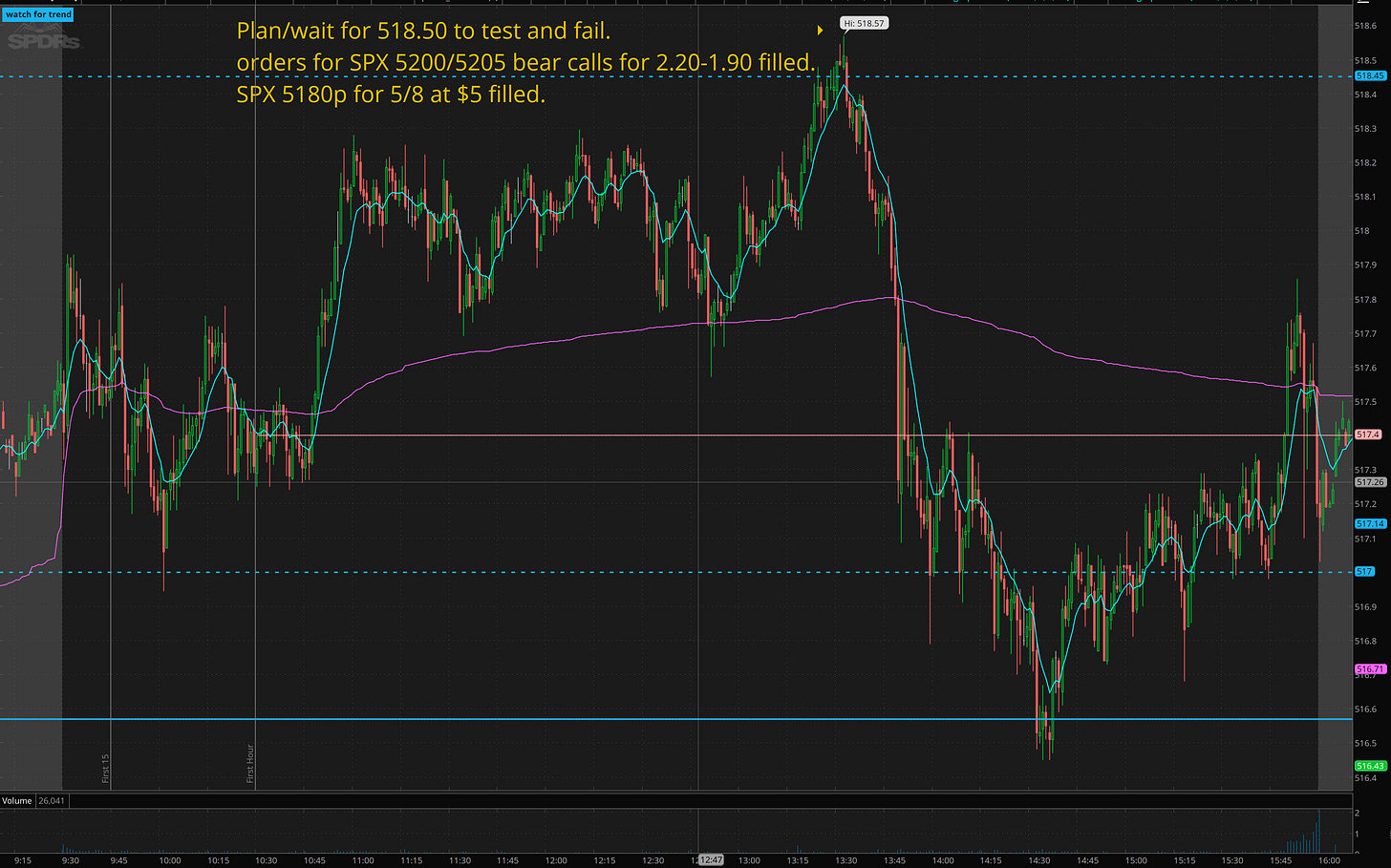 With that in mind as market moved closer to 518.50, I alerted my plan for credit sells as well as a swing short order on SPX 5180p for 5/8.