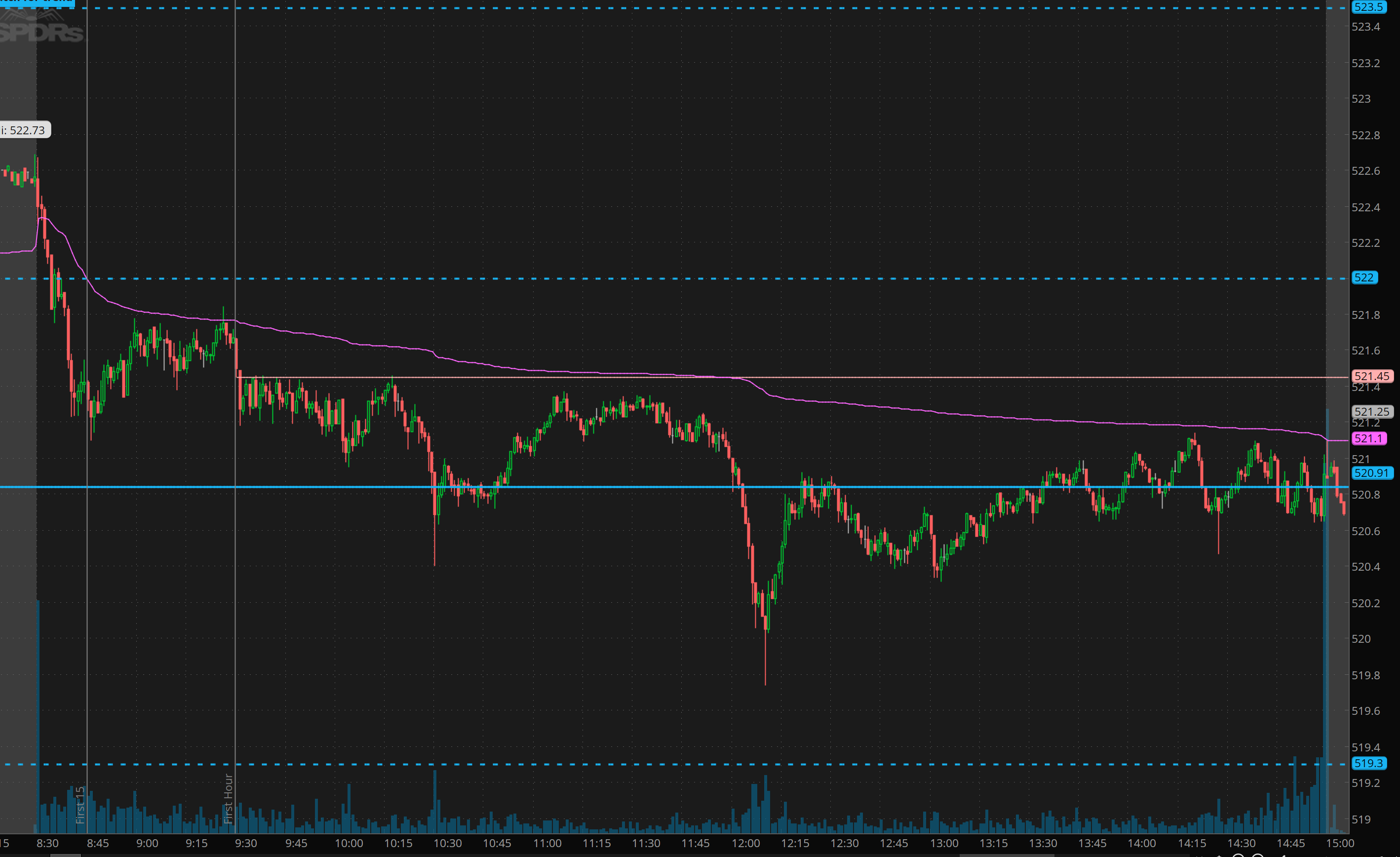 Yesterday’s action wasn’t a surprise, but it didn’t make for a setup that matched my desired trade ideas. Didn’t get 523.50 tested, and I didn’t believe we were going to 519.50 after vwap rejected after the first hour. As I wrote in yesterday’s blog I expected consolidation action and tight range and that is more or less what happened.