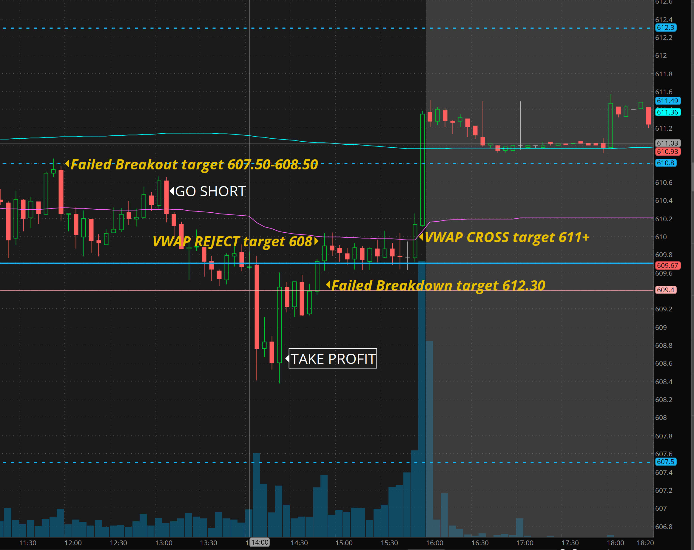 SPY 0.00%↑ - consolidating around 611.50 with dips to 610.25 bought and 611.50 sold