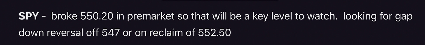 Perfect possible failed breakdown reversal. I wrote that I must go long yesterday ideally at 547 and 552.50 reclaim. We got both! I was targettting gap fill but with that volume it triggered a massive buying spree and short squeeze into 560.50!