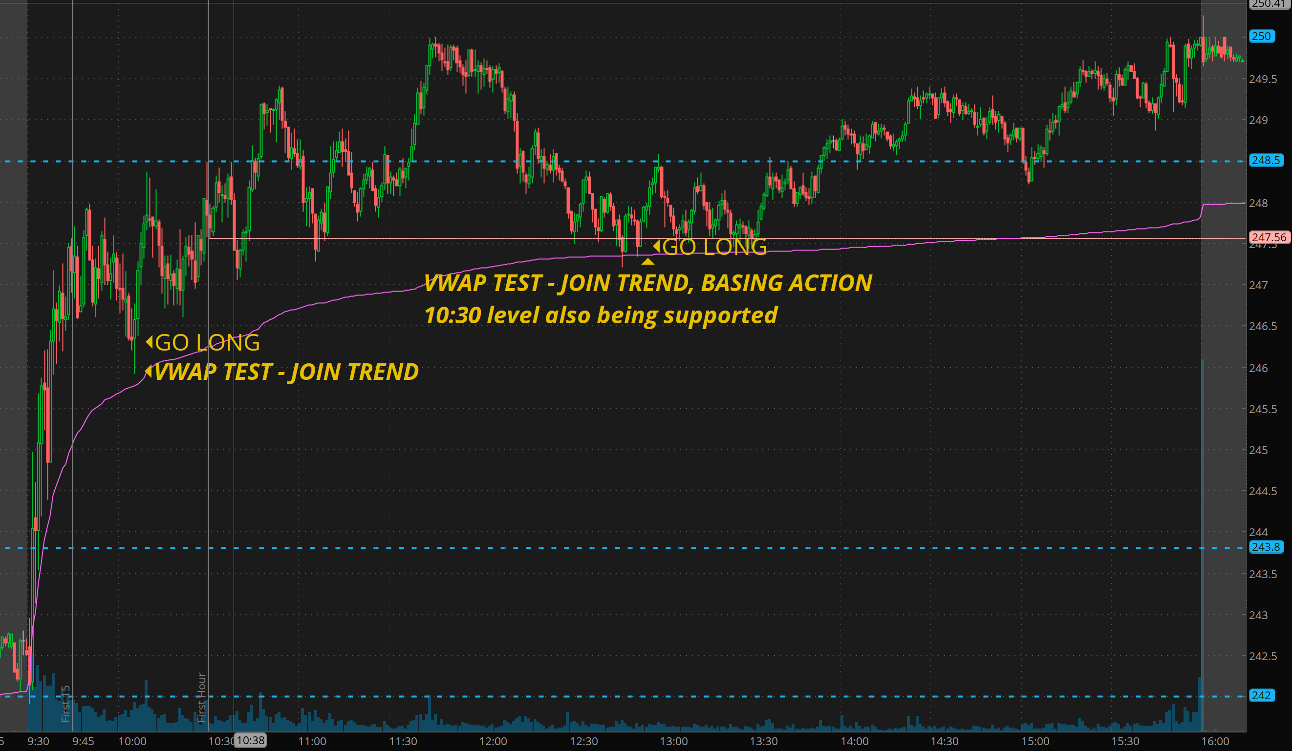 Once TSLA started running and breaking out, how do you join? I added this chart for education. You go long at vwap. Also after watching, you can see how we had 2-3 hours of basing action where 247.50 held. When that happens you can expect a possible gap up coming and or more upside rally the next day unless some negative news comes.