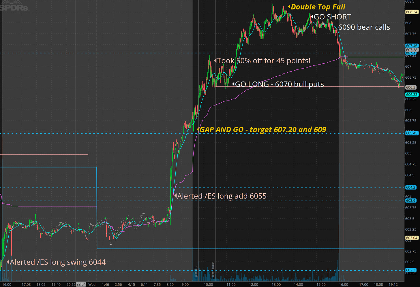 SPY - gapped up ripped right of 605.50 level to 607+, almost reached 609 target but failing at 608.50.
