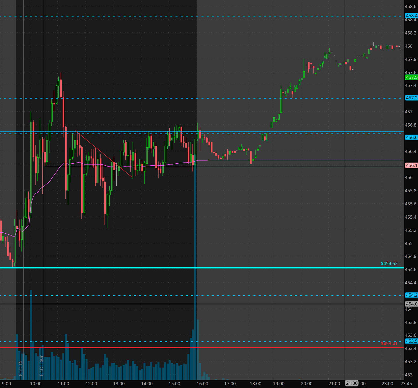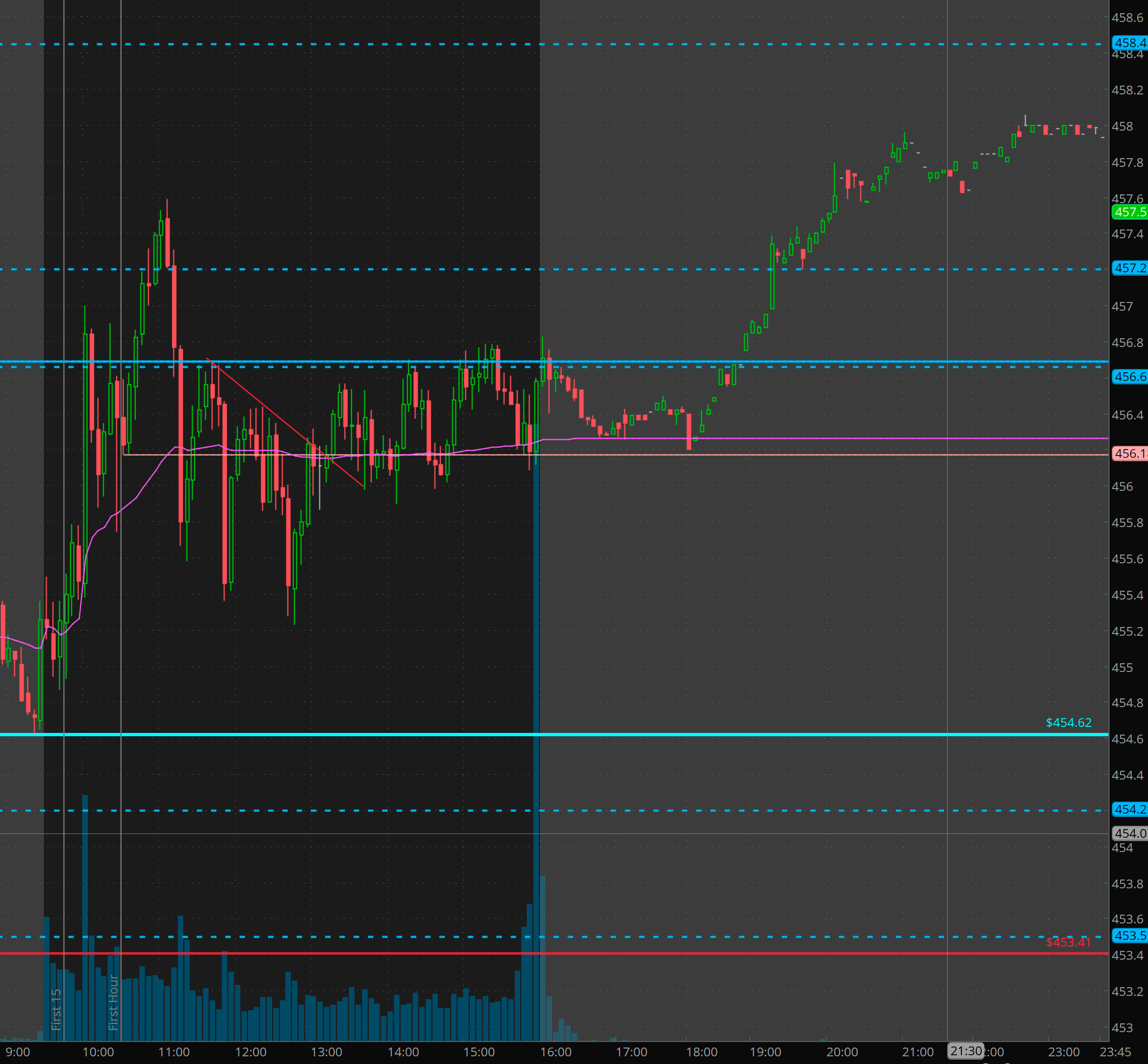 The morning kicked off with a strong rip but it failed again at that key 457.20 area. I had sold some bull puts which got stopped and then gave a much better entry around 1pm in the afternoon. Sure enough the algo identification of which contracts to sell at the highs and the lows were spot on.