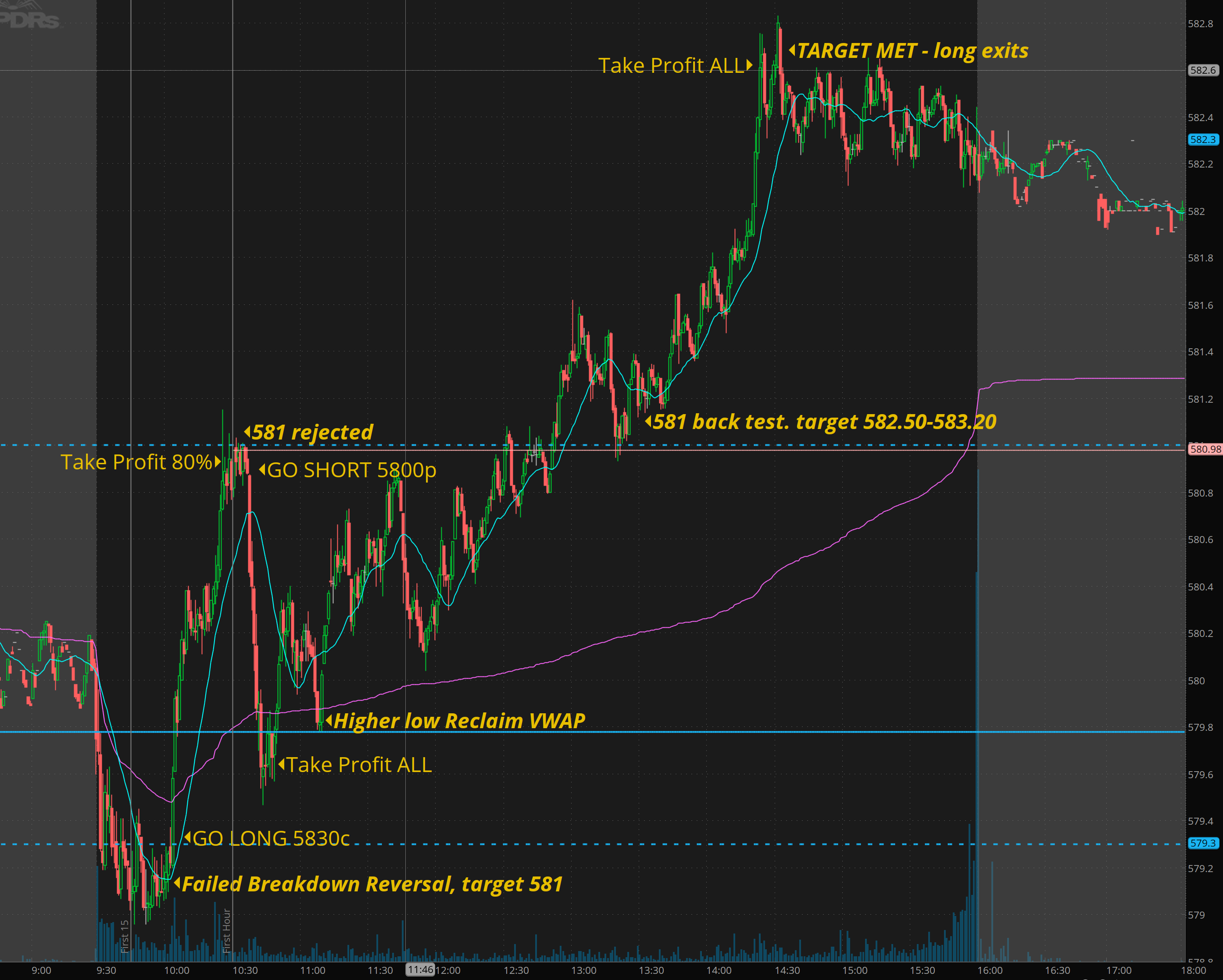 SPY back tested 579 like we wanted then tested 581, dipped again, to rebuild support and then ripped into 582.50 which was Tuesday supply area. Then it more or less was it wait for TSM e/r before continuation.