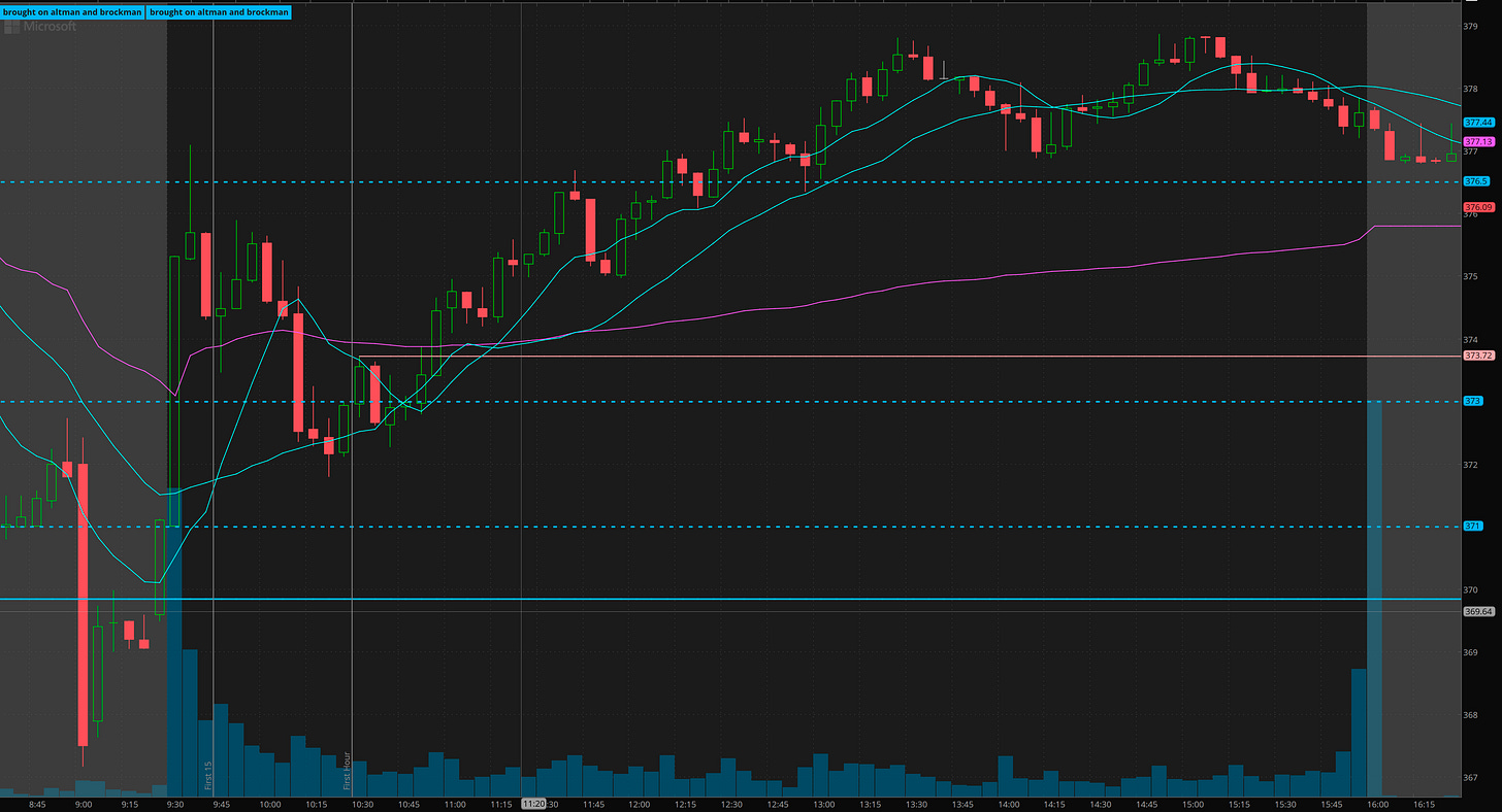Got short on 376 rejected, luckily added just when it was about to break vwap, for a 50% gainer, but I was stubborn and stopped out for small gains. Made a short attempt a second time thinking 376 double top but that got bought up and that was it for me.