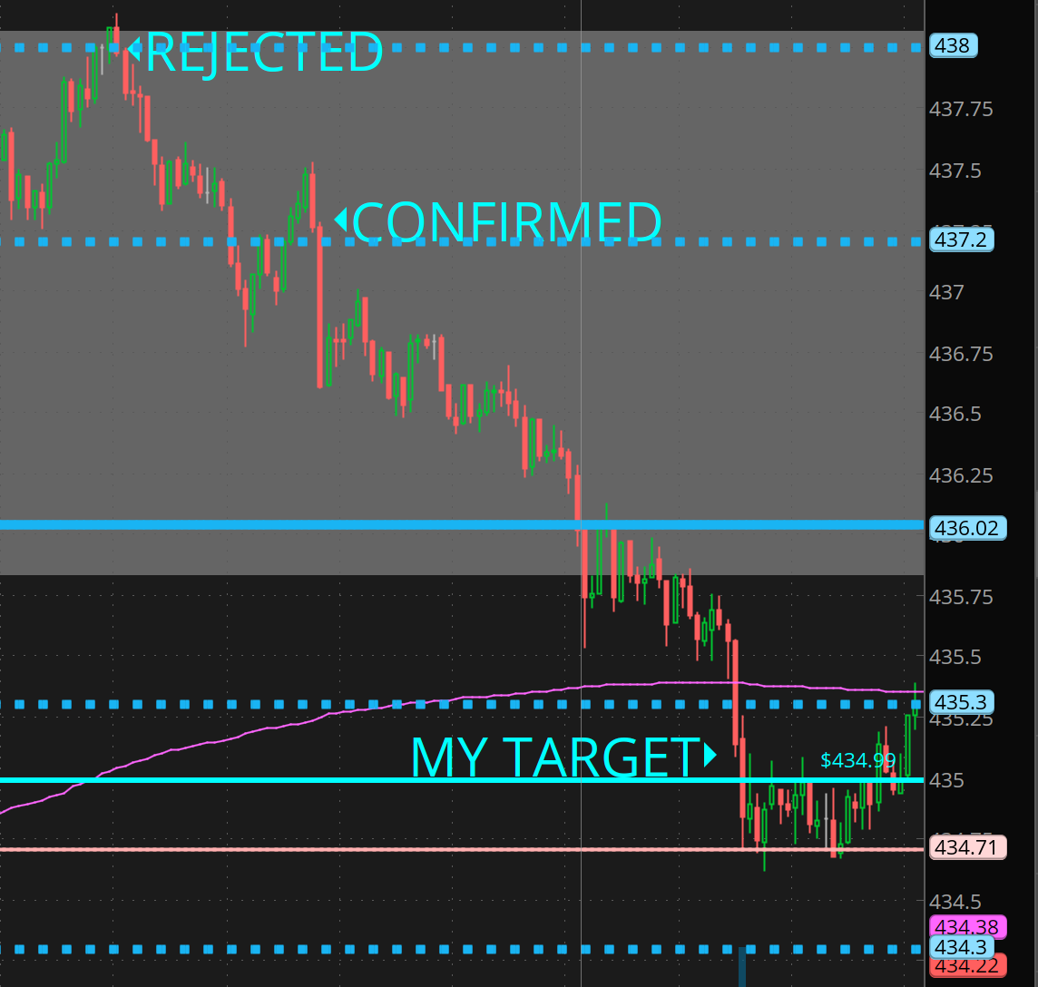 SO I woke up around 12:30pm, and here is the action in SPY, clean rejection. As it approached 438, it looked like it was going to break out further and squeeze, trapping bulls, but 438 is a strong level… And so we planned for the short.