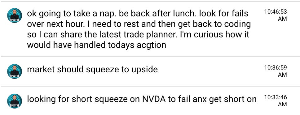 Let’s review the action. Members that study my 3 Killer Trade Setups and put it to use got paid yesterday. The open gave us a text book gap down reversal setup that followed the process to a T. I was coding all night (working to add Algo generated Trade Plans into Edge Trade Planner) so while I caught entry for the long, I took profits early and told members I needed to take a nap and would come back and trade the move after lunch. This is one of the great things about Two Hour Trading. One can focus on planning and entries, be systematic about taking profits, and then just wait for the trades to come to you. And soon waiting will mean getting algo signals 10 to 30 minutes before moves trigger, so we don’t have to sit and look at charts all day.