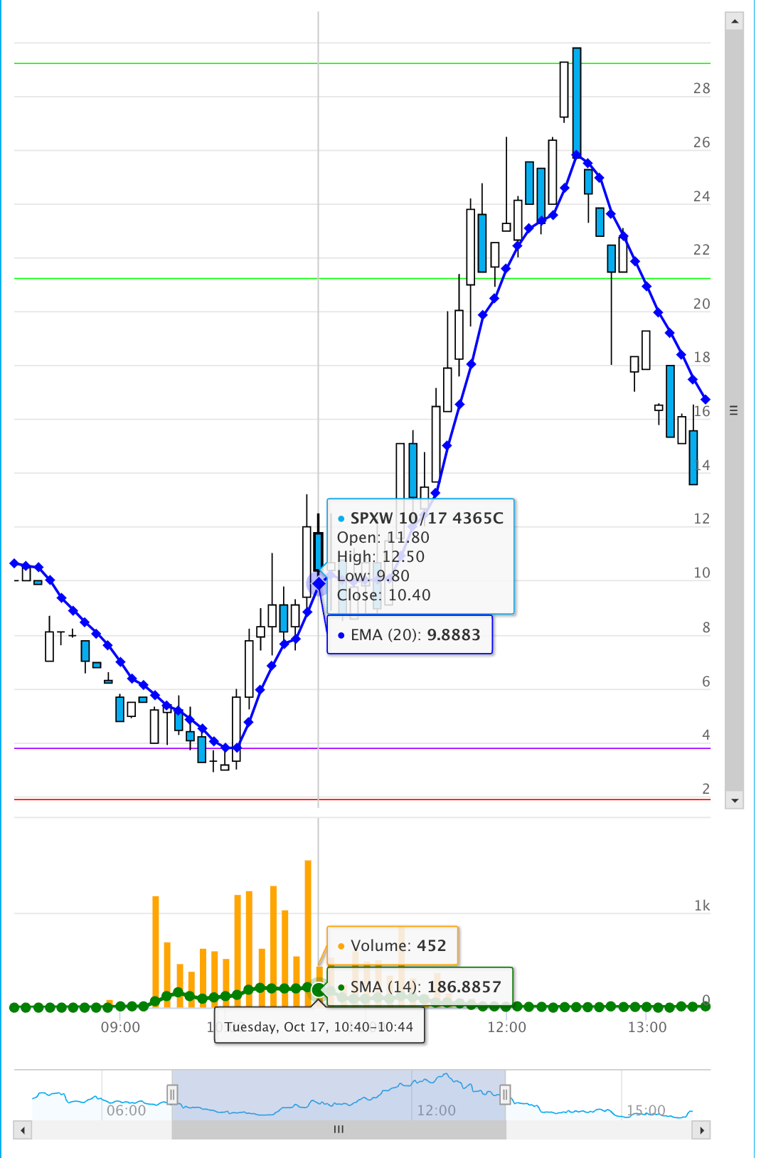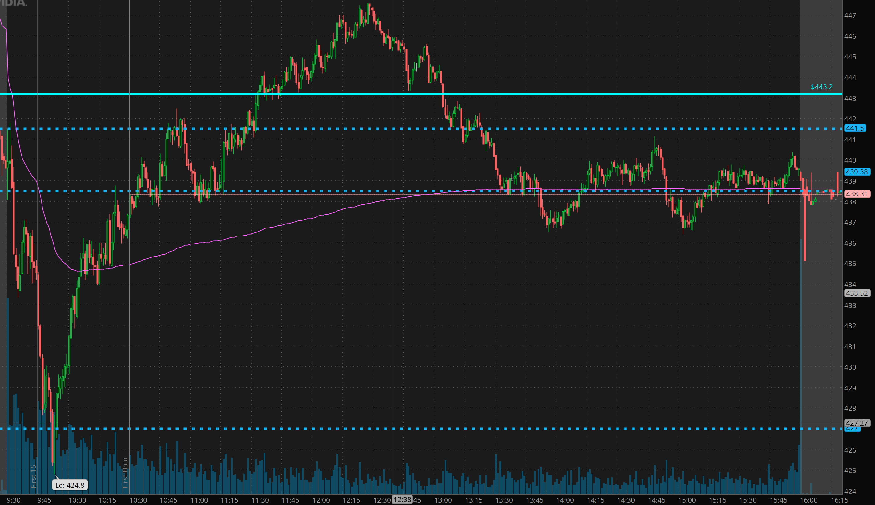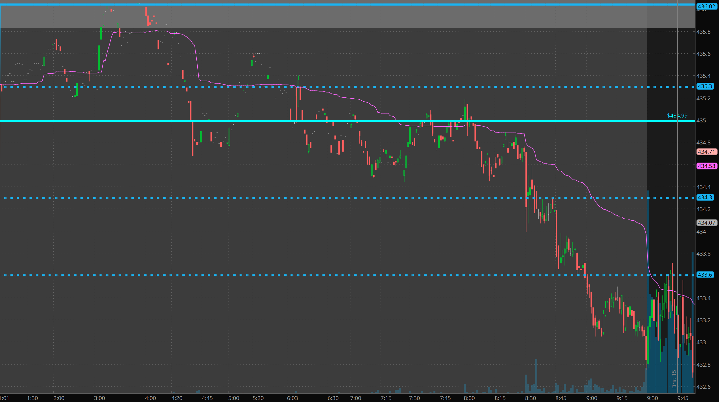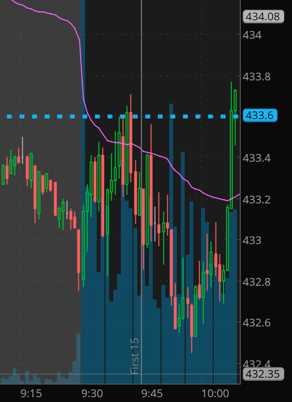 This is how things looked after the first 15 minutes. That reaction/rejection of 433.30 looks so bearish. But you have to ask yourself, is going short hear worth the risk? DO NOT get so focused on making a buck that you lose sight of the bigger picture which is that we have a large gap down. I regularly miss the trend on gap and go moves because I HATE THE RISK. I’ve had contracts lose 50 to 80% of value in seconds on chasing trend.