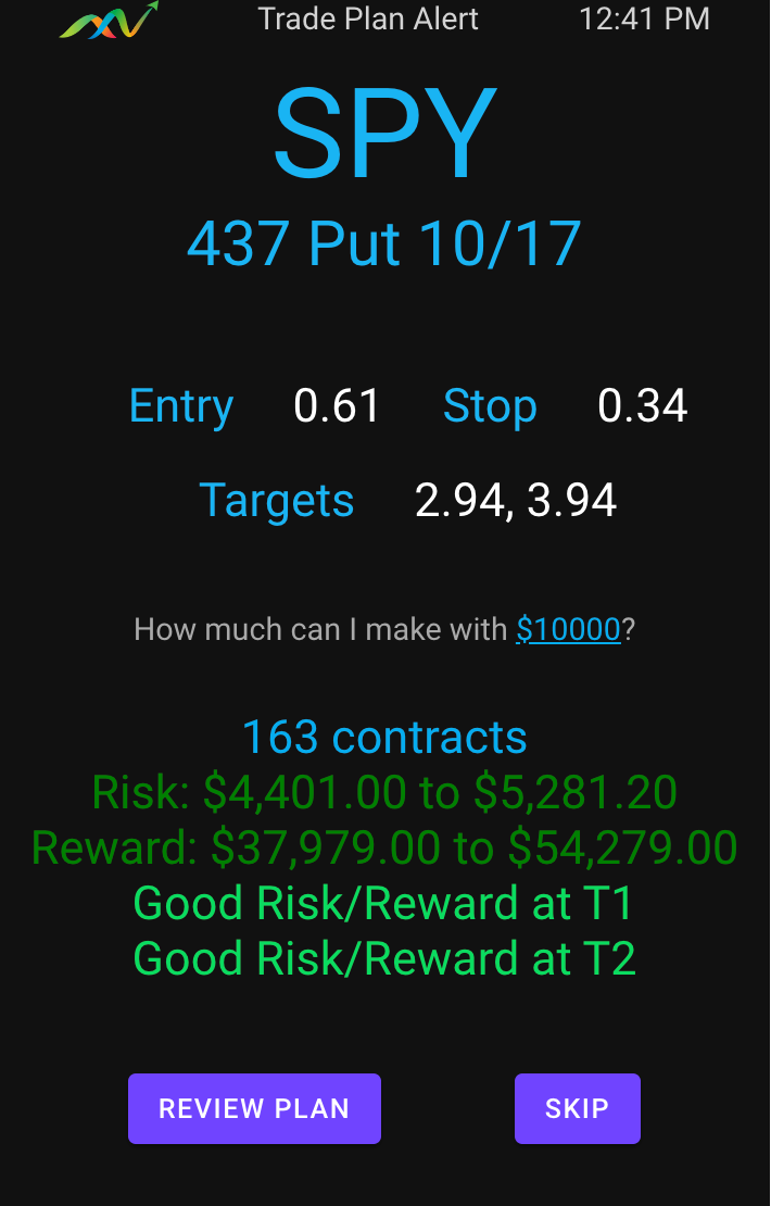 The sell targets were aggressive and I need to dig in and figure out why it gave the contracts such an extra premium (predicting option prices is very hard!). That said, when a plan is alerted, you can click Analyze/Plan and then adjust the take profits orders to fit your multiples. 0.60 to 2.60 to the magic peach line is good enough for me. That is a 7R trade! I’m ecstatic with anything over 4R.