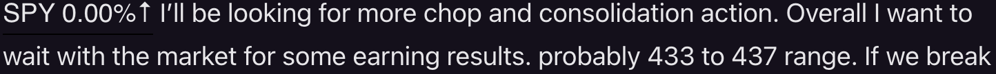 I’m looking for more of the same, but have a small bearish bias. That said I continue to watch SPY 0.00%↑ bounce and consolidate between 432 and 438. Which ever way and when it decides to breakout or break down we should get a nice paying trade. From 432s I plan for calls,, and from 437s I plan for puts. If we open heavy and 435.30 is back tested I may consider a short with a tight stops.