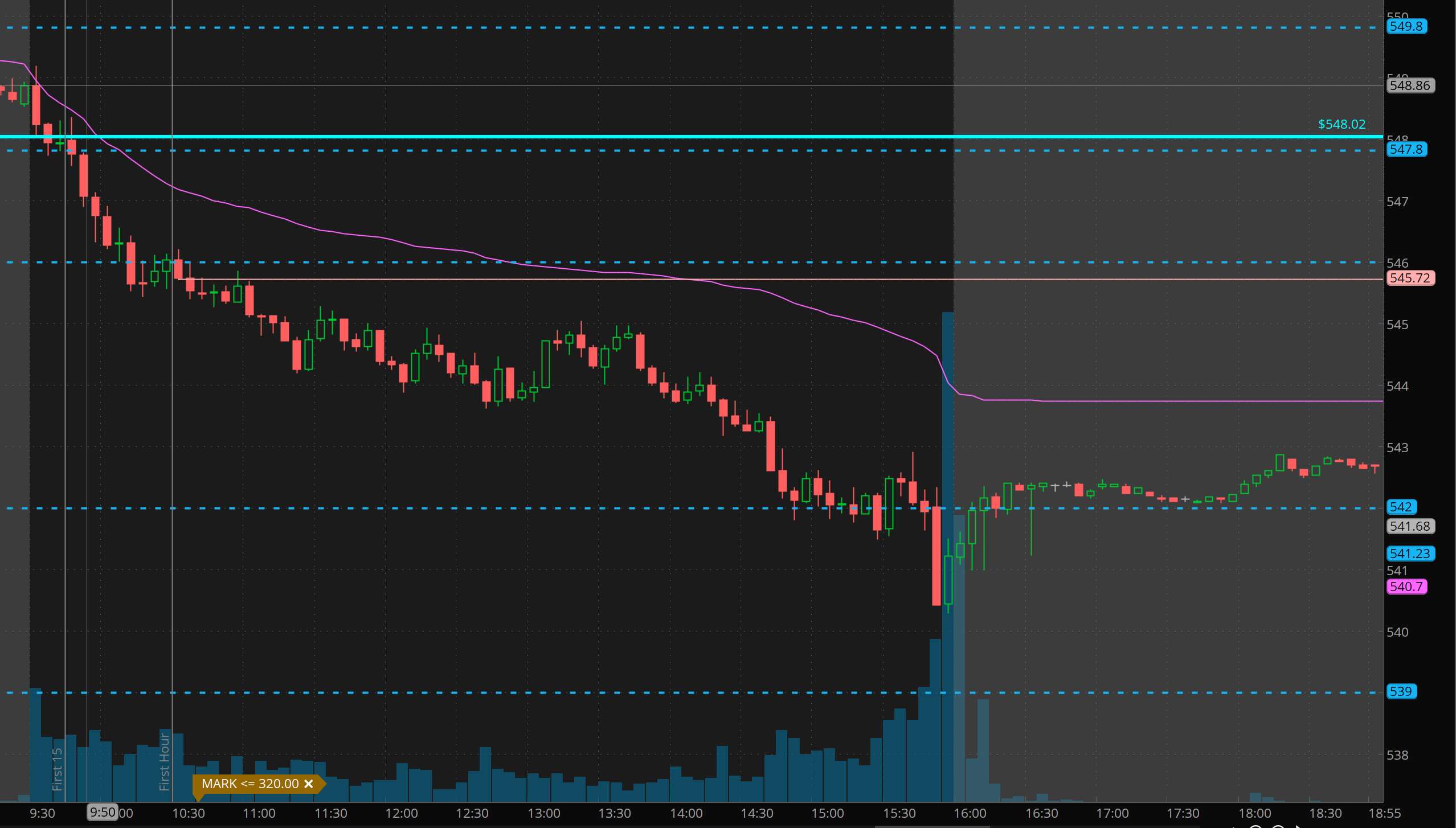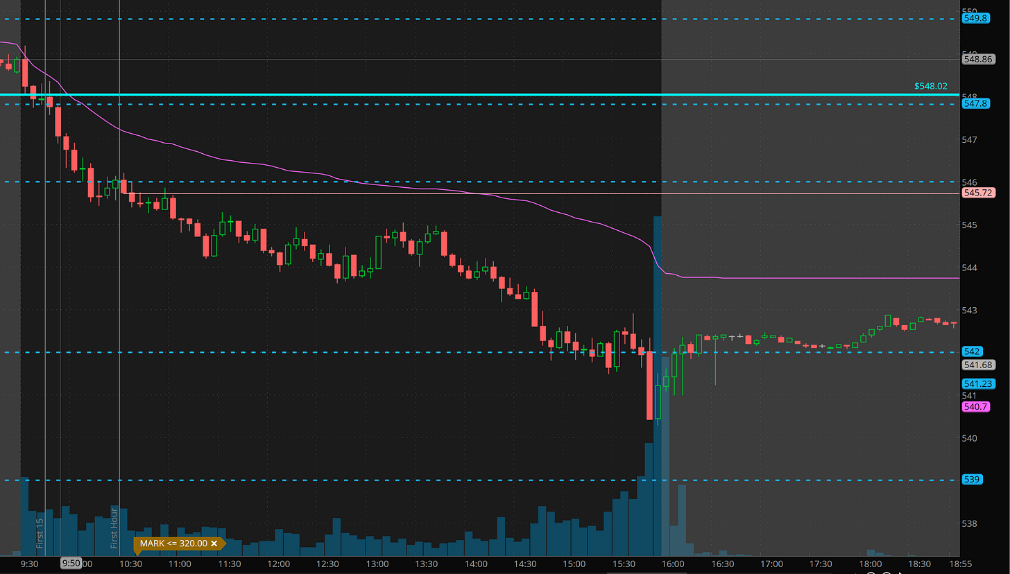 Wow. I missed most of the drop yesterday, waiting for my orders to fill after SPY broke 548. That is OK. I’ve trained myself to not chase, and I need a back test for an entry or an excellent risk reward. I was able to scalp a long for small bounces a couple of times for 50-100% gains and also lost a couple of times on the long side looking for that back test to come! The selling was relentless. I then had to be patient and was able to scalp a 5-7 bagger trade in the last 15 minutes.