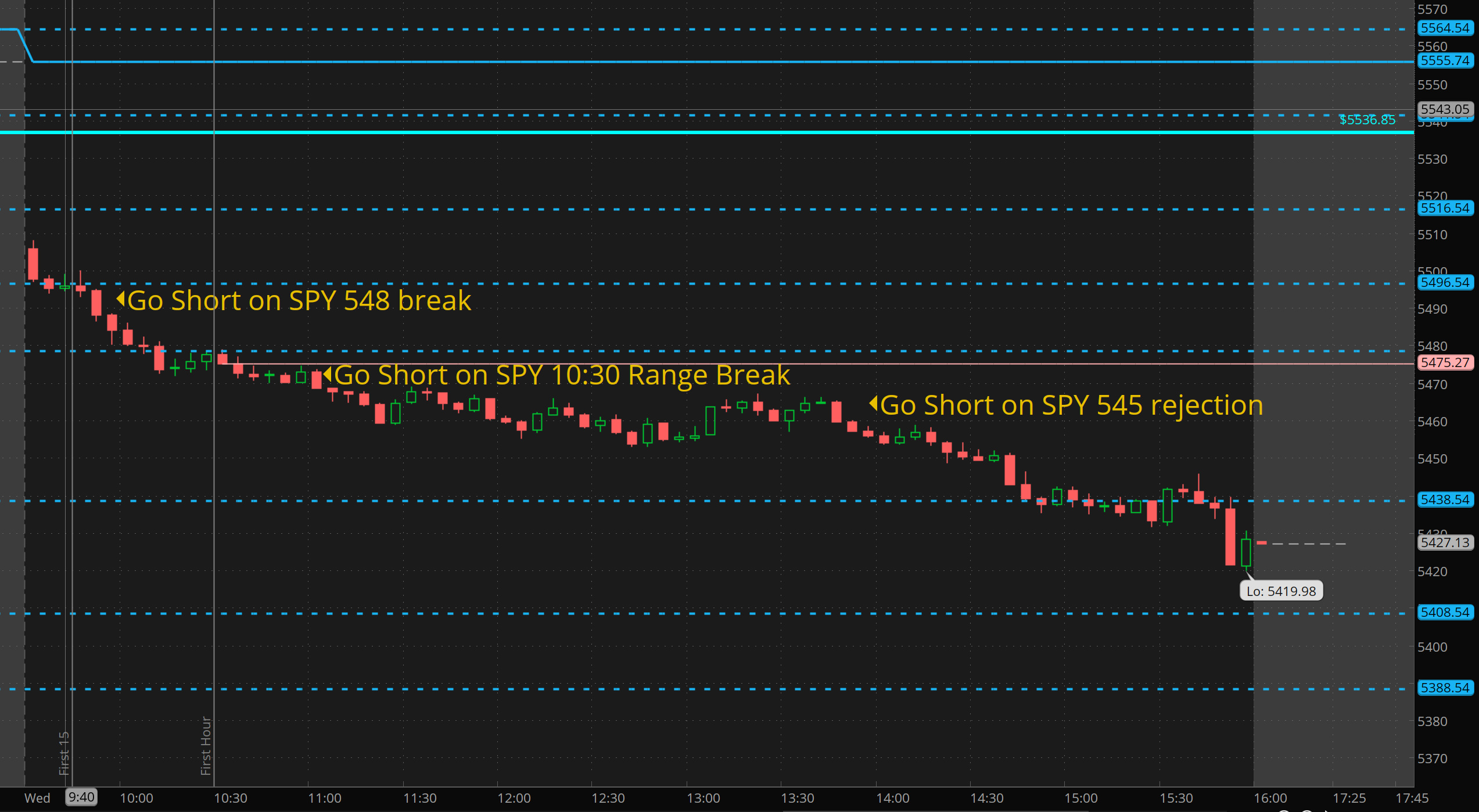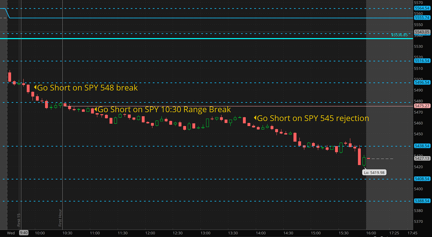 Let’s review. Yesterday SPY broke 548. I spent most of the day waiting for a pop to get entry. I alerted I was hawking SPX 5450p for $2 when it was around $3 after lunch. It dipped to $2.60 and than ripped to $28 by end of day!! I ended up chasing at $4.