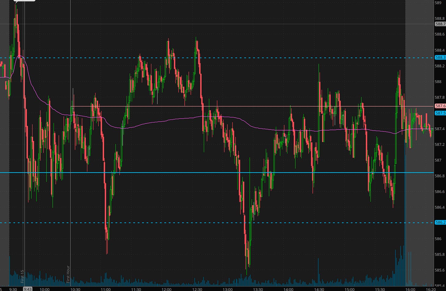 Yesterday’s close put in a mini double top and established some toppy action opening the door for a short again. My plan look to see if 586 broke overnight and if so go short. In hindsight, I should have kept adding to /ES short over 5900 as long as 5930 didn’t clear. Took short on seeing SPY 586 break and also too SPX 5820p for 4.60.
