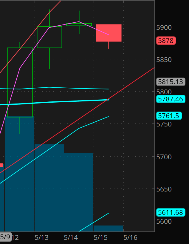 After so many green days and large moves to the upside yesterday gave us an indecision candle. In theory /ES 5850 and 5815 are targets below. That gives us roughly SPY 581.50 and 577 for downside targets.