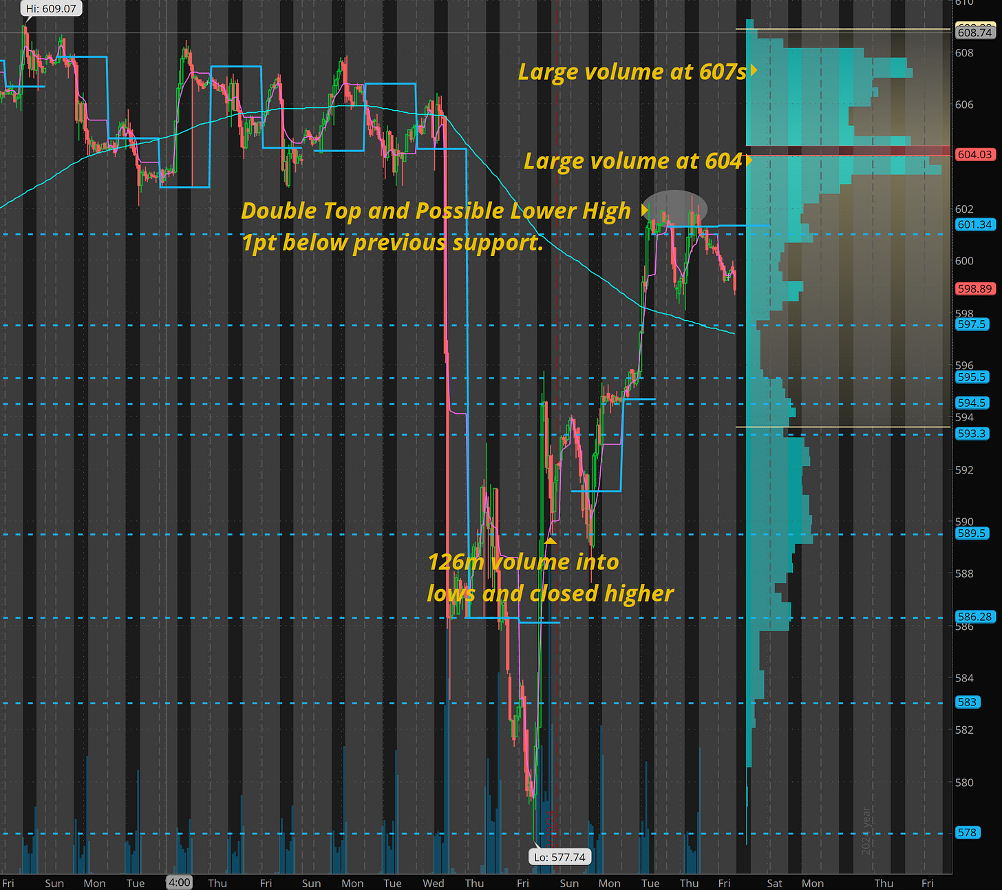 I had network issues at my new airbnb and bad cell coverage so barely go to trade yesterday, but I was trying to postion for a rip into 603-604, expecting a testing of this level before more selling comes. After reviewing the chart, I see we have a failed breakout over Tuesday highs. The highs also turned out to be 1 pt below the 603.20-603.50 support level. This could be a lower high, double top, with a failed breakout.