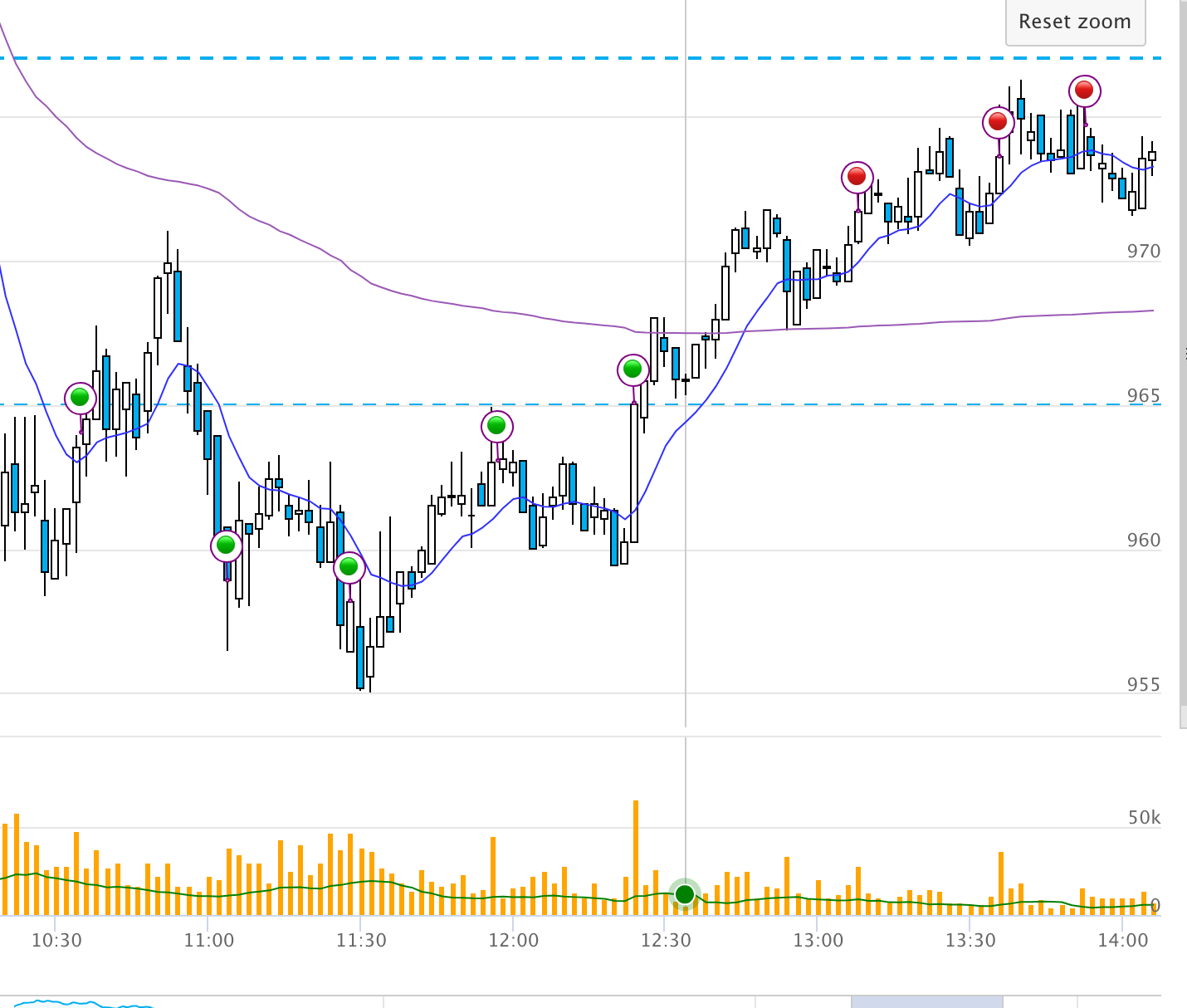 Green dots = look for long