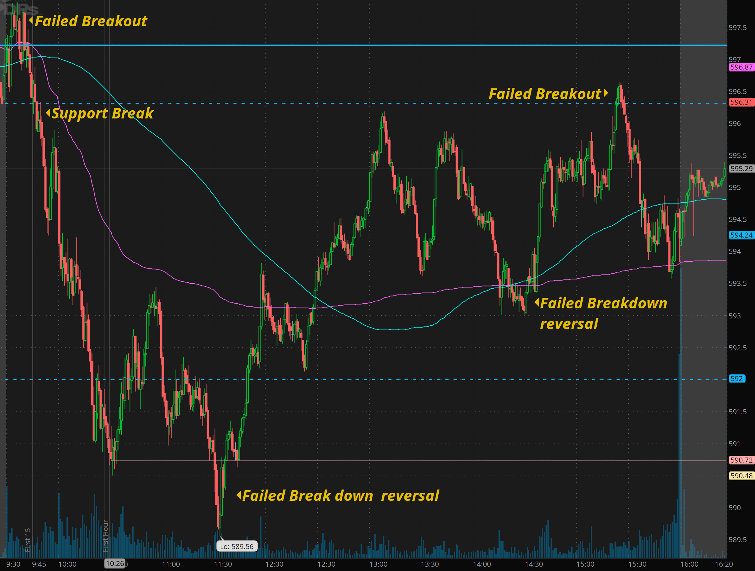 SPY - dropped to backtest the 590 support level and then tested 596 before dipping back into vwap at the close.