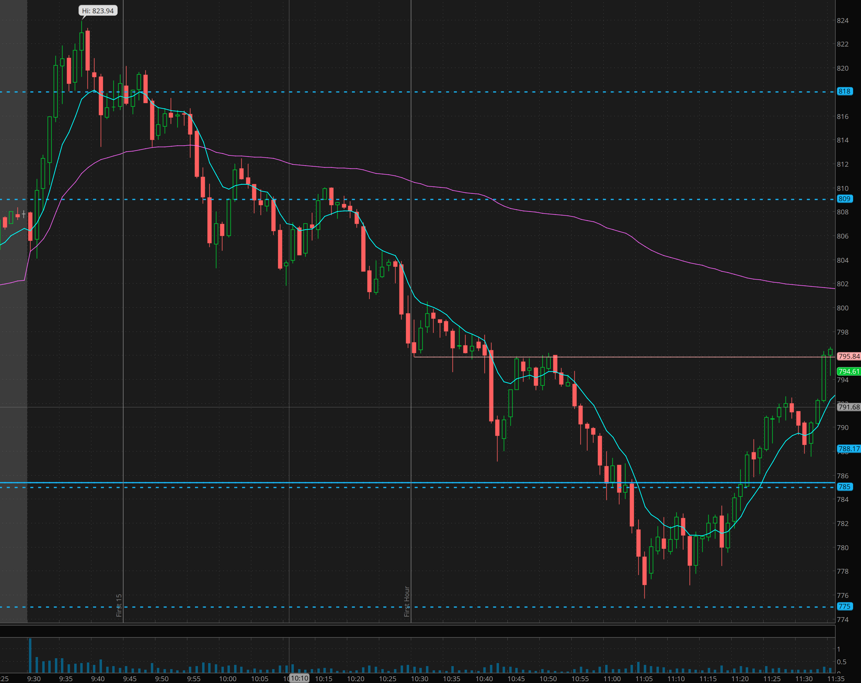 And we got exactly that. I tried for a long at the r/g line, but got stopped as it flushed toward 775. Then went long again on the 785 reclaim with contracts going from $2 to $8.