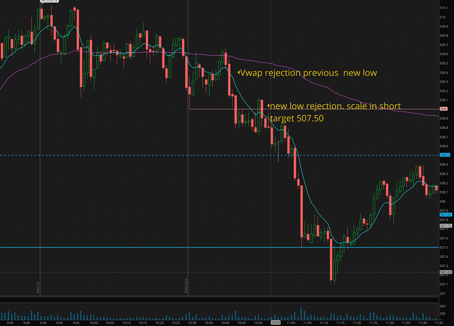 One of my 2 primary trade setups are gap reversals. In this case, we had a gap up from 507.50. Then every push over 510 was met with sell during first hour. You can see a top being put in.