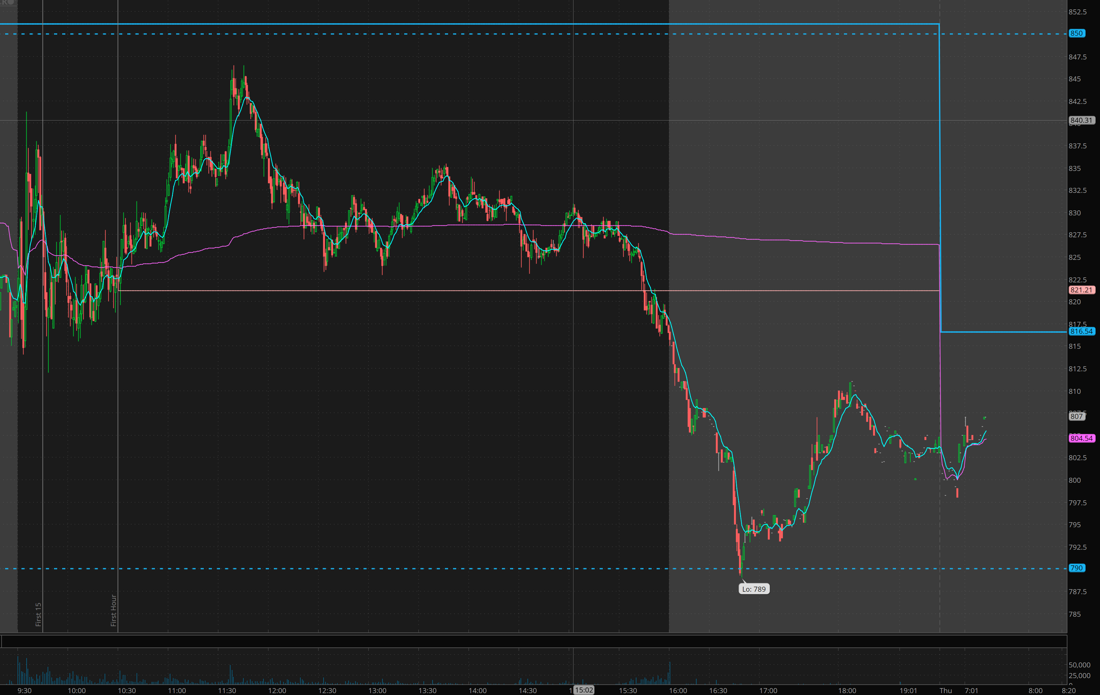 Definitely weaker than NVDA as it couldn’t even get to fill the gap. it provided a double top and failed breakout reversal on break below 841, eventually selling off to the 790 target in after hours.