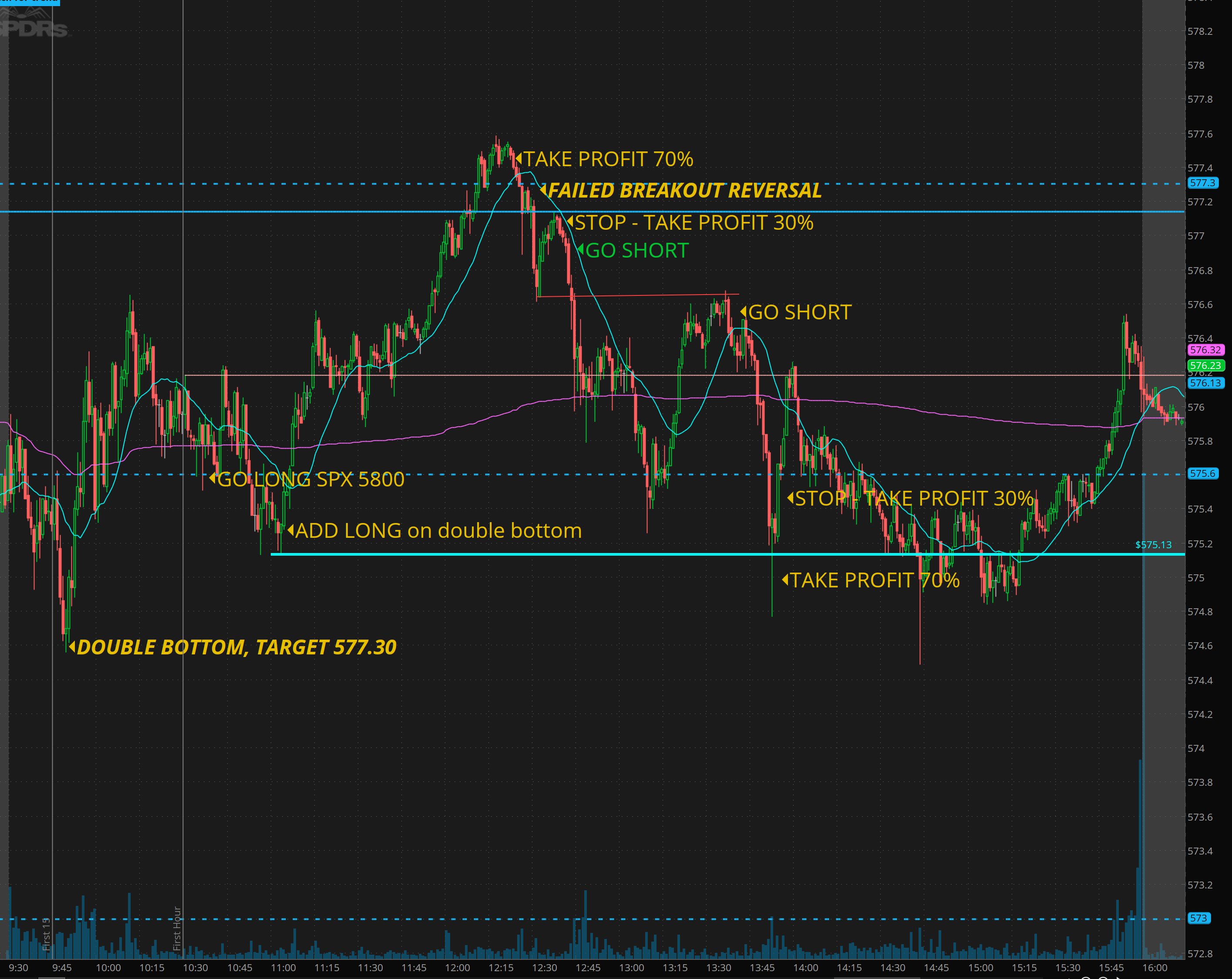 After CPI data came out SPY established support at 574.50. We basically got a dip there and then rallied to test Wednesday’s high, failed, and then dipped back to test the morning lows, leading to another failed break down reversal at 574.50 for the mini squeeze into the close I called out.