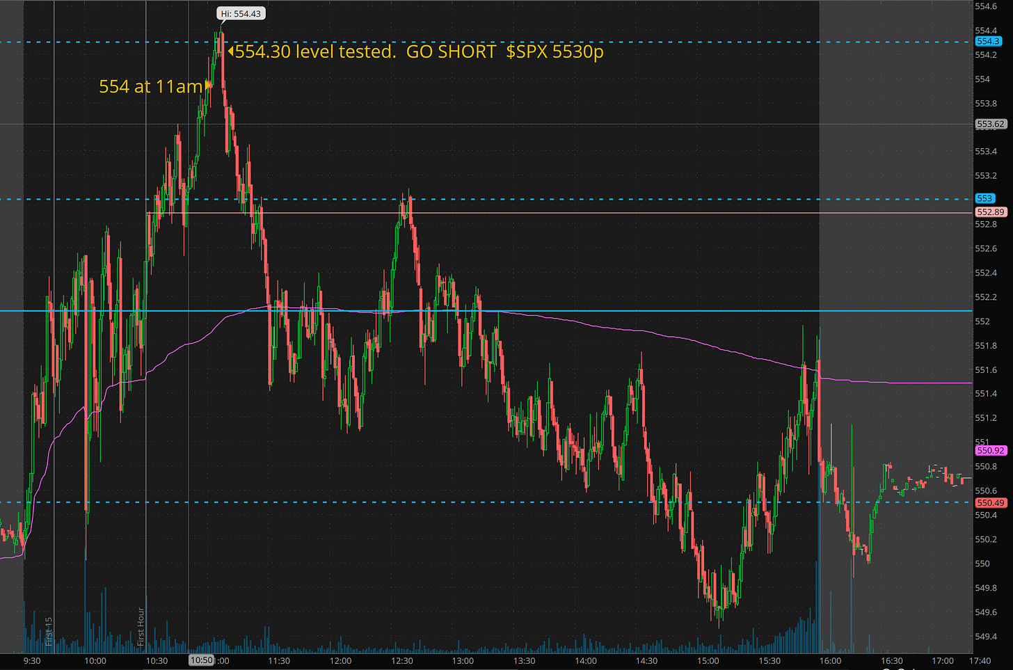 Yesterday I shared one idea which was SPY popping to 554 to get short, and that was exactly what happened. We popped exactly to the SPY 554.30 level at 11am (which I predicted and shared to THT-PRO members) and then proceeded to sell off to 549.50 by end of day.