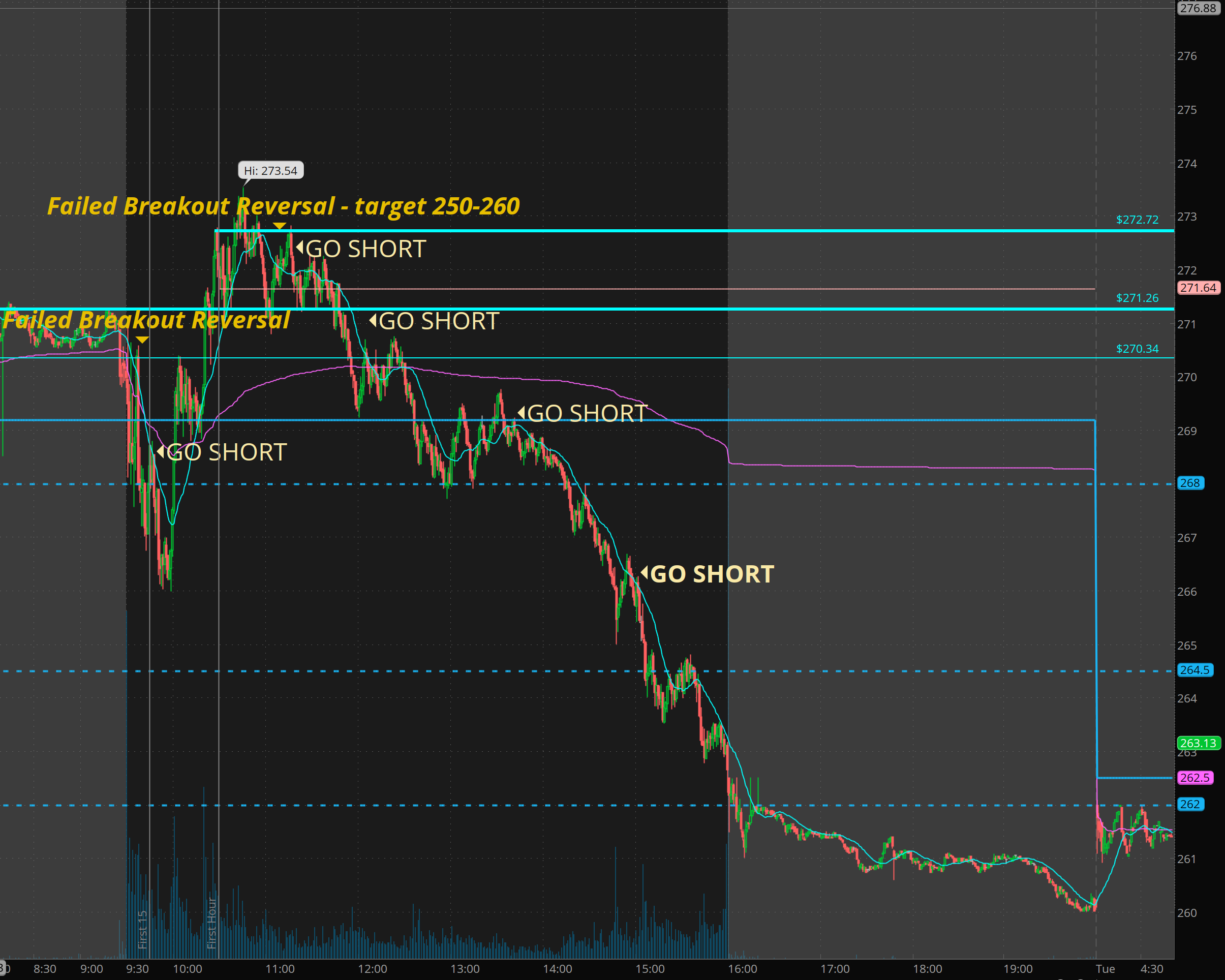 TSLA - tested 271 and gave me my favorite gap up reversal setup, however it stopped me out at first and had to go back in. It finally broke 268 support and sold off to 260.