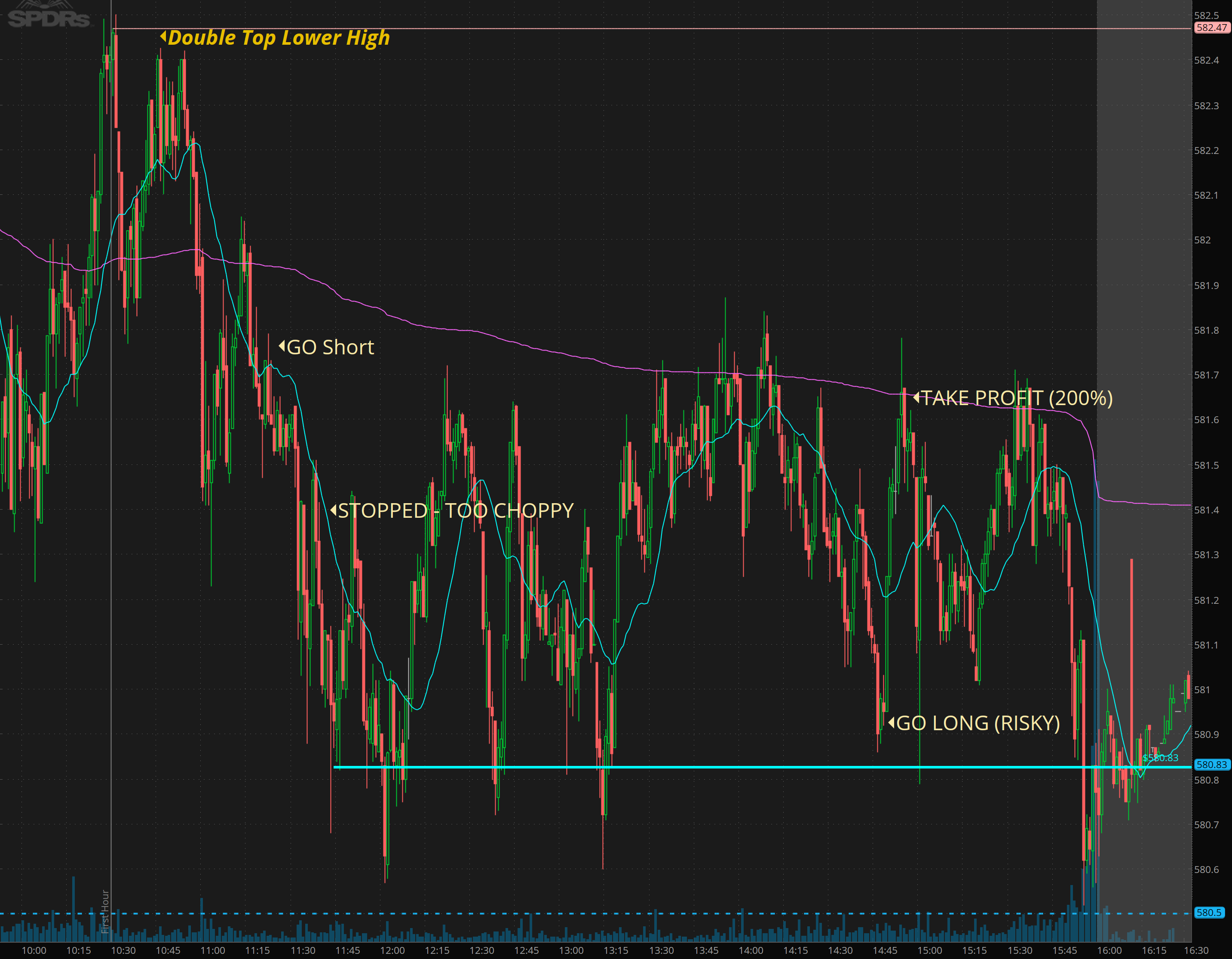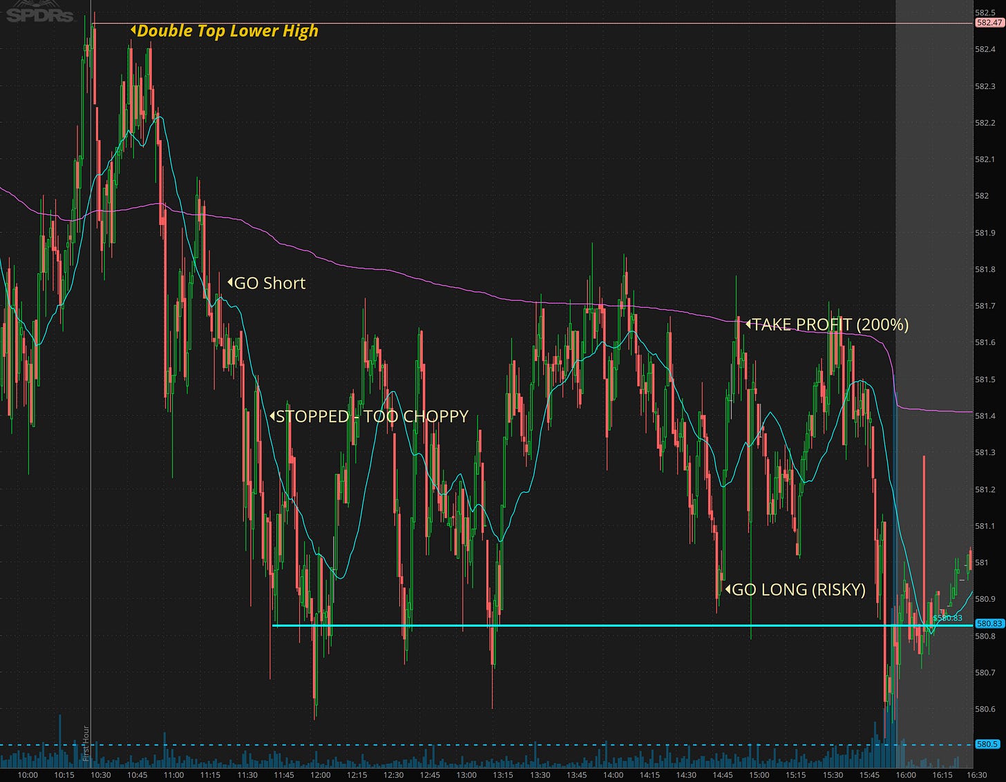 Overall, yesterday I did a lot of waiting. Bottom line SPY didn’t setup into one of my ideal trade setups. Made 2 attempts to short for some gap fill in the morning the contracts were so juiced that they only did about 50%-90% gains from my entry and I ended up stopping out flattish. I warned members that to avoid trading that action and maybe we get something in afternoon.