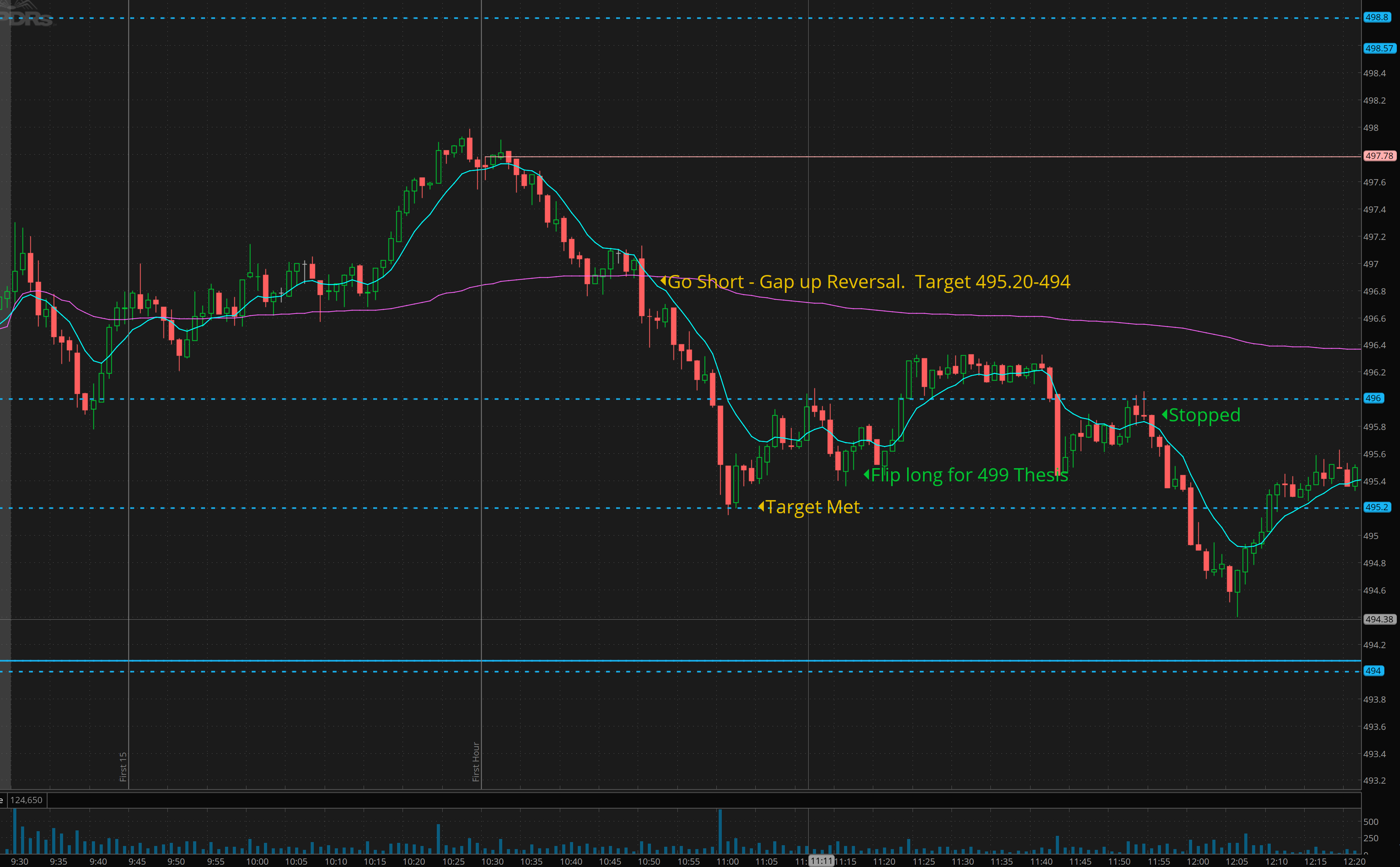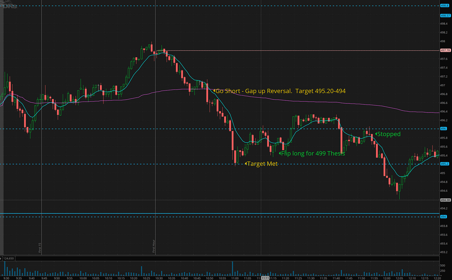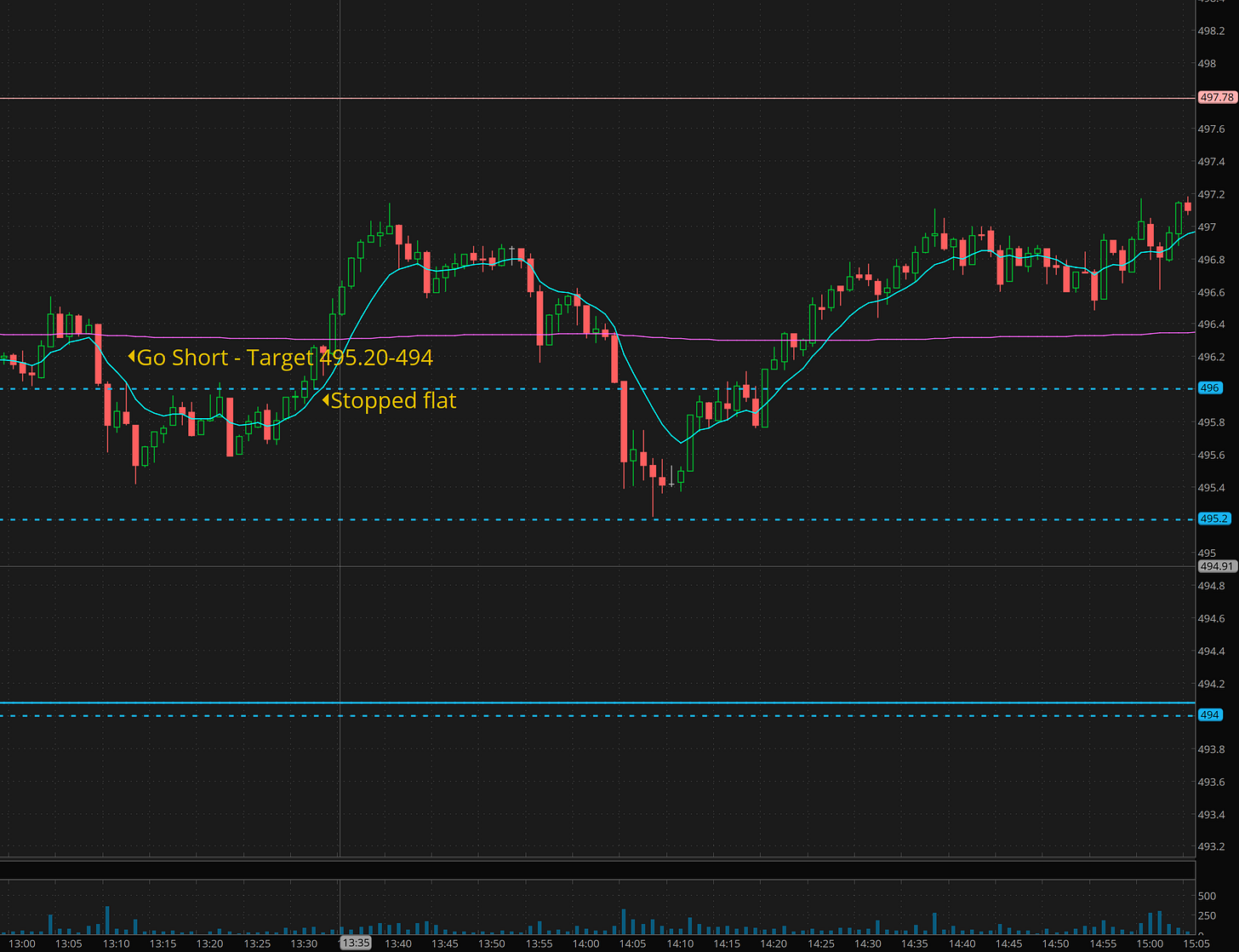 Now this is where I made a mistake. I got long off 495.20 and I had mentioned that 496.50 needed to reclaim for upside. I should have been reloading short around 496 for the next leg down/flush toward my overall 494 goal to get swing longs on SPY.